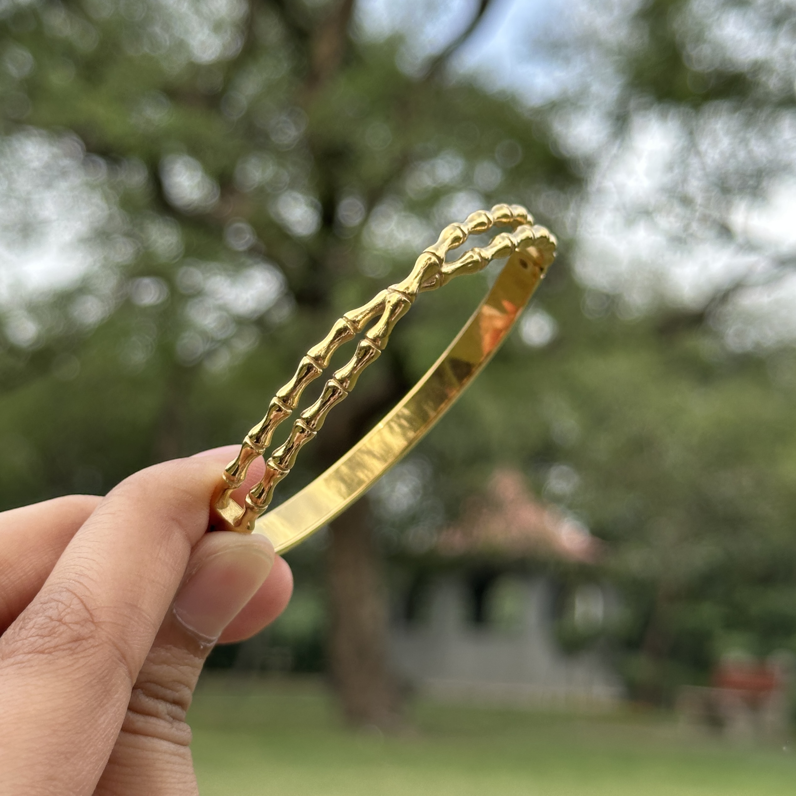The Bamboo Cross Bracelet brings together structure and movement in a very effortless way. Inspired by the clean, elongated feel of bamboo, the design is elevated with two sleek lines that cross gently at the center, creating a soft, almost infinity-like form that adds depth without being too bold. It’s minimal, but not plain, the kind of piece that stands out quietly. Made with a stainless steel base and finished with an anti-tarnish coating, it’s designed for everyday wear without losing its shine. The openable design makes it easy to put on while sitting comfortably and securely on your wrist. It works beautifully on its own for a clean look, but also layers well with other pieces if you want to build a stack without it feeling too heavy.