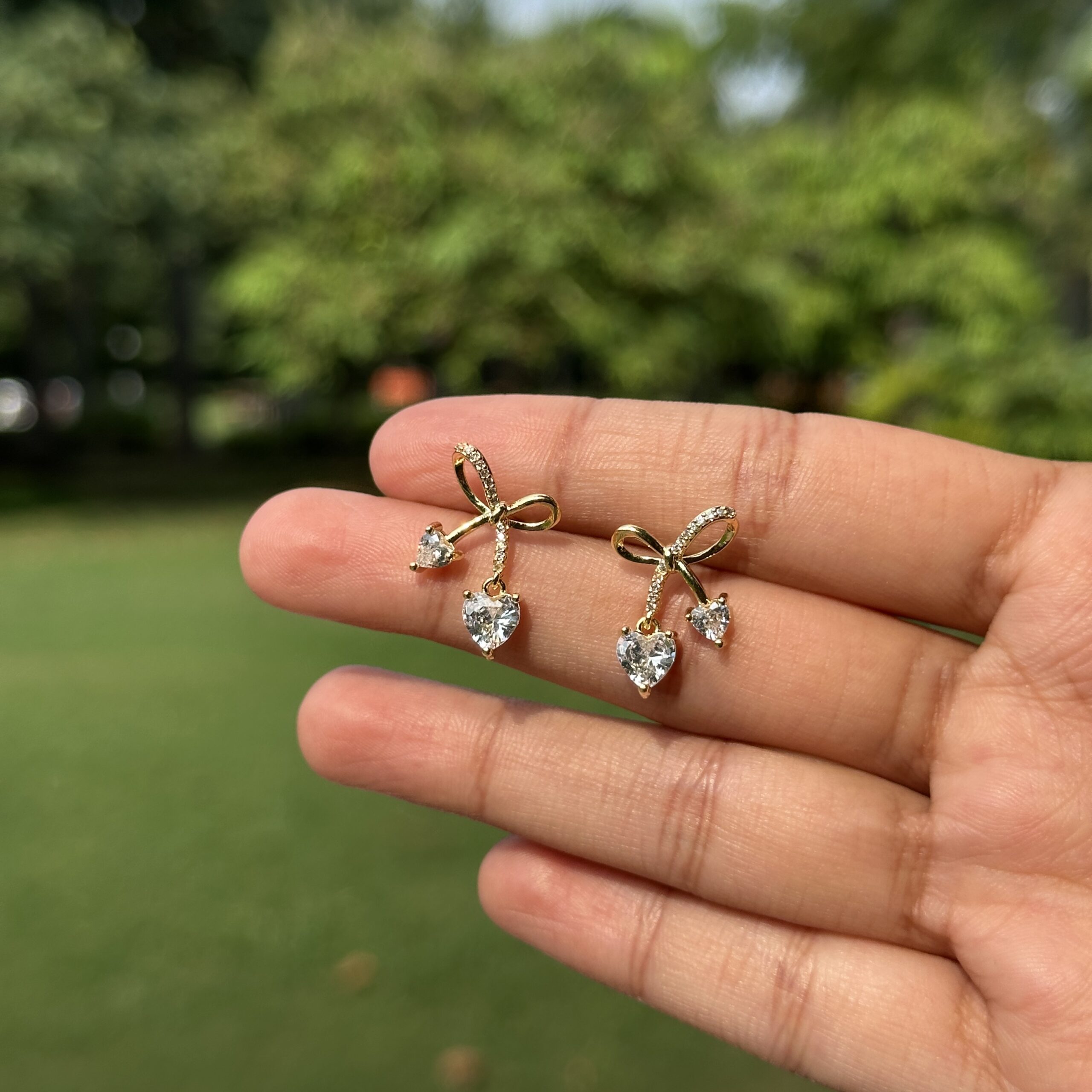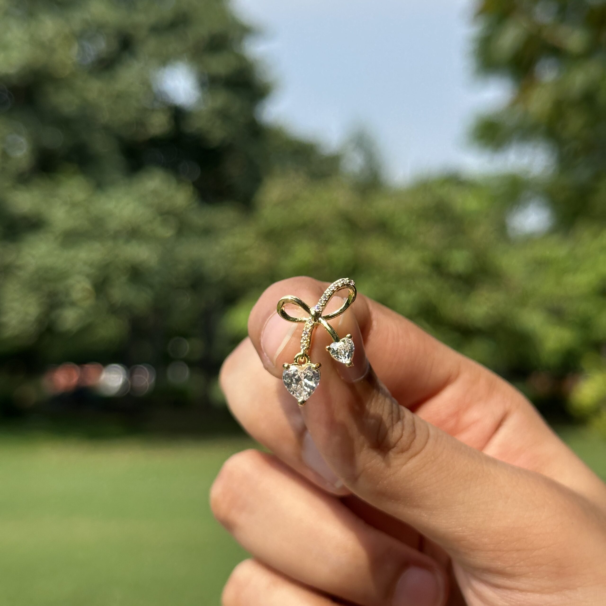 Bow Charm Earrings pair a delicate bow-top motif with two sparkling heart drops for a look that’s both playful and polished. The design centers on a slim ribbon stud, partly pavé-set with baguette and round cubic zirconia / AD stones, that splits into two fine stems holding a petite heart and a slightly larger heart-shaped cubic zirconia / AD drop. The mixed-scale composition creates a charming, asymmetrical balance that reads beautifully in photos and up close, making these bow drop earrings ideal for shoppers searching for cubic zirconia bow earrings, heart drop studs, or AD stone dangle earrings. Finished in a bright plated tone with an anti-tarnish coating, Ribbon Charm Earrings offer the shine of fine jewellery while remaining lightweight and comfortable enough for daily wear or special occasions.