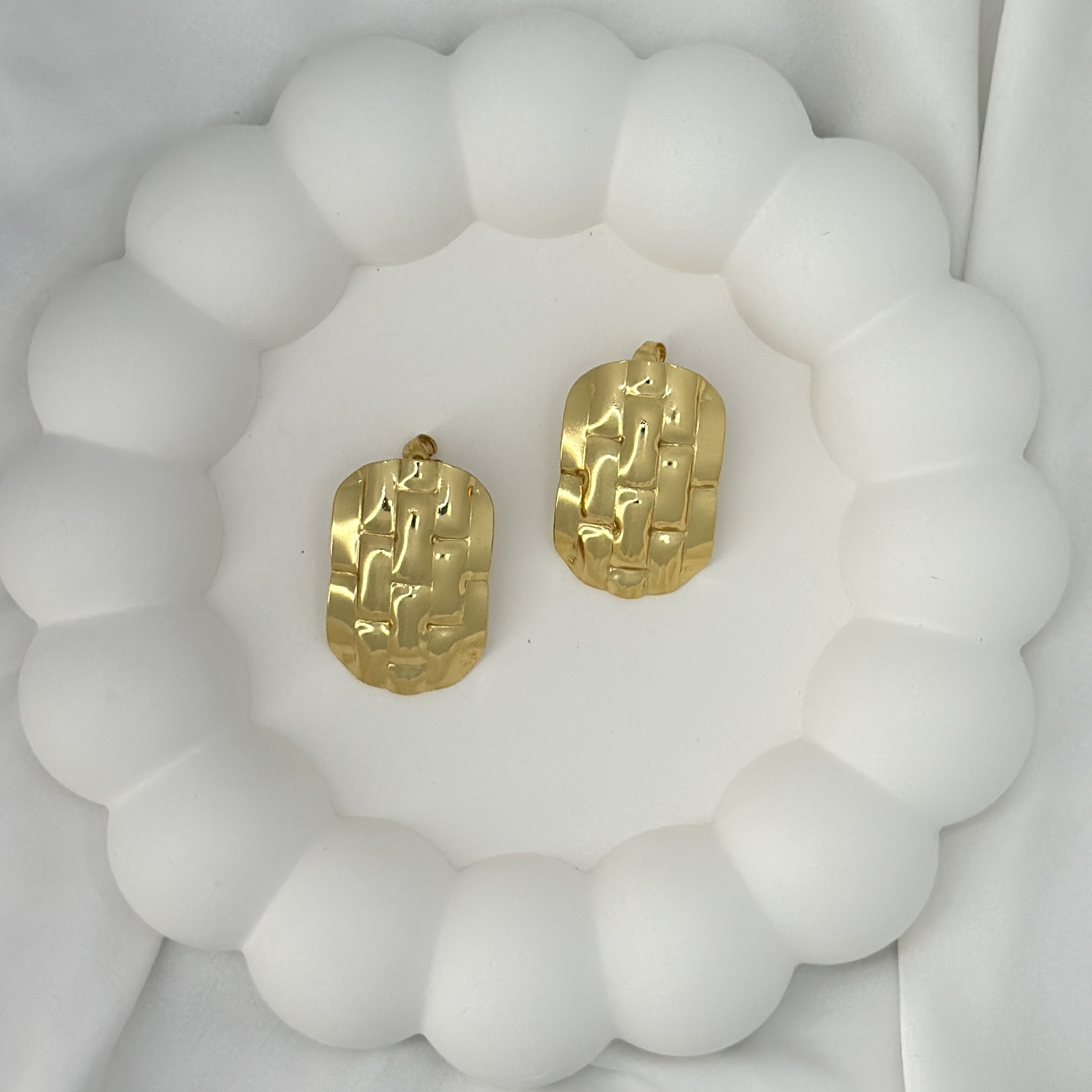 The Braided Panel Earrings turn a classic woven motif into a bold, wearable stud. Each oval plaque is gently contoured and stamped with an interlaced relief that catches light across its ridges and flats, giving the surface a lively, dimensional sheen. The pieces are sized to sit close to the lobe so they read immediately and confidently on the ear without dangling or shifting, a sculptural finish that feels both modern and timeless. Because the texture plays with light, these earrings look different from each angle: from a distance they read as a sleek polished surface, up close the woven pattern becomes the detail you notice. The result is a versatile, statement-making stud that’s easy to wear day-to-night and pairs well with everything from relaxed linen to tailored suiting.