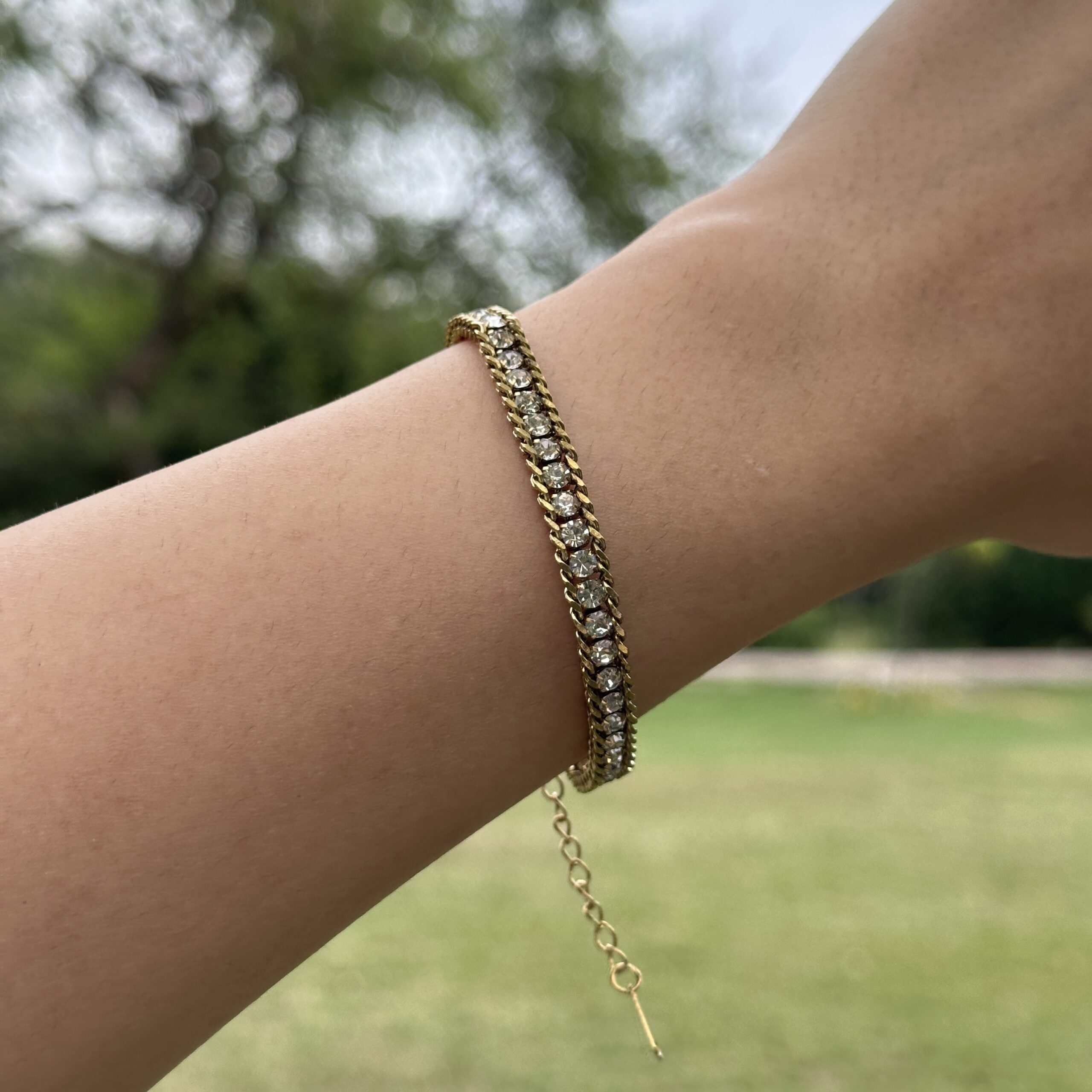 A refined anti-tarnish bracelet designed with a structured chain base and a continuous line of fine stones running through the center, creating a subtle yet striking shimmer. The balanced design gives it a polished look without feeling heavy, making it perfect for both everyday wear and slightly dressier moments. Lightweight and easy to style, it pairs effortlessly with watches or other minimal bracelets, or can be worn on its own when you want a clean, put-together finish with just the right touch of shine.