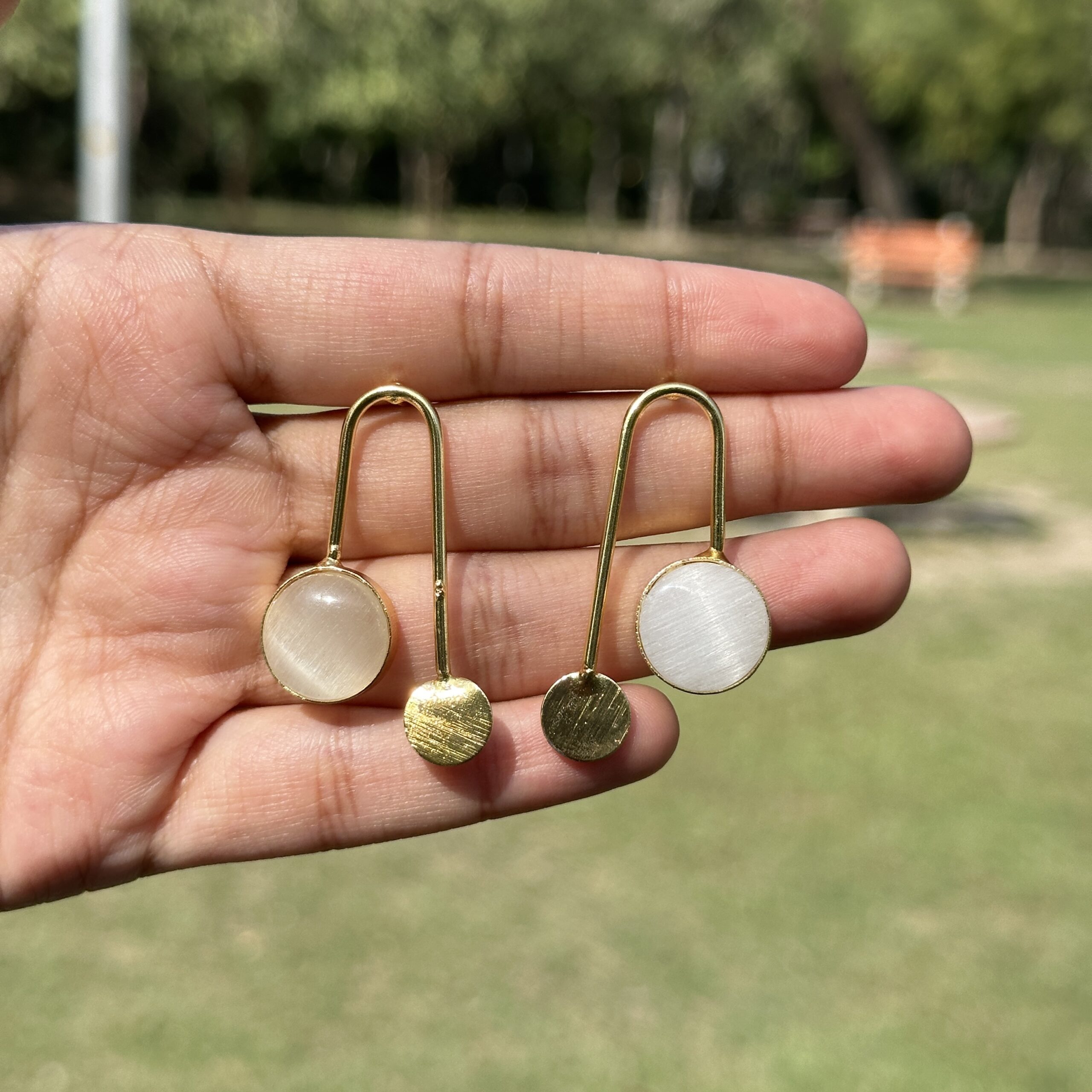 These Jaipuri earrings are designed with a clean and modern look, featuring a unique open-drop shape paired with two contrasting discs, one soft ivory-toned semi-precious element and one textured gold finish. Crafted in brass with a rich gold-like tone, the design reflects a minimal yet thoughtful take on traditional Jaipur craftsmanship. The smooth, slightly uncut-style stone adds a natural glow, while the simple structure keeps the look light and effortless, making it perfect for everyday wear or subtle statement styling. The balanced design gives it a contemporary feel while still holding onto its ethnic roots, style these with a crisp shirt, a simple kurta, or even a monochrome outfit, and keep your hair tucked behind the ears or in a low bun to highlight the clean lines and soft shine of the piece.