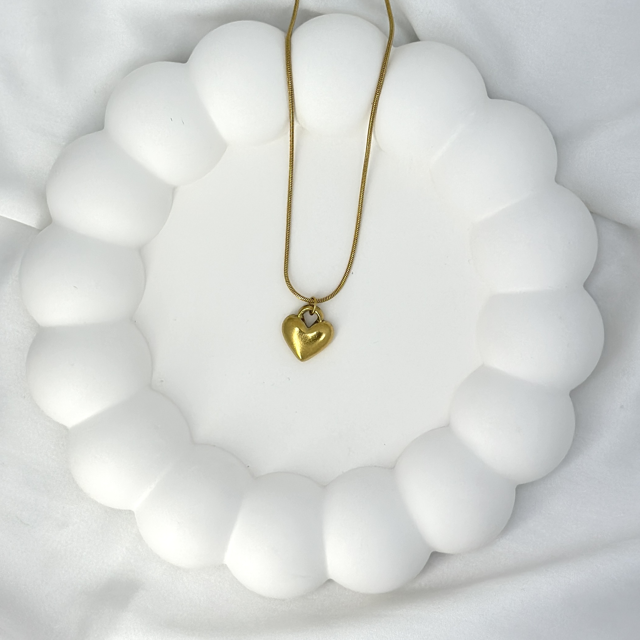 The Cloud Heart Necklace features a sculpted, puffed heart pendant with gently rounded edges and a satin-lustrous face that reads soft and modern at once. Its tactile, three-dimensional silhouette catches light across the curves, giving the piece a quiet glow that feels intimate rather than flashy. Suspended from a smooth snake-style chain, the pendant sits close to the collarbone and moves naturally with the wearer, an understated focal point that lands perfectly between casual and refined. Because of its compact scale and lightweight build, the Cloud Heart works seamlessly from day into night: it brings a subtle sense of warmth to simple weekend outfits and a polished, personal note to work-ready tailoring or evening dresses. The overall mood is contemporary and approachable, a little modern charm that reads as thoughtful, not literal.