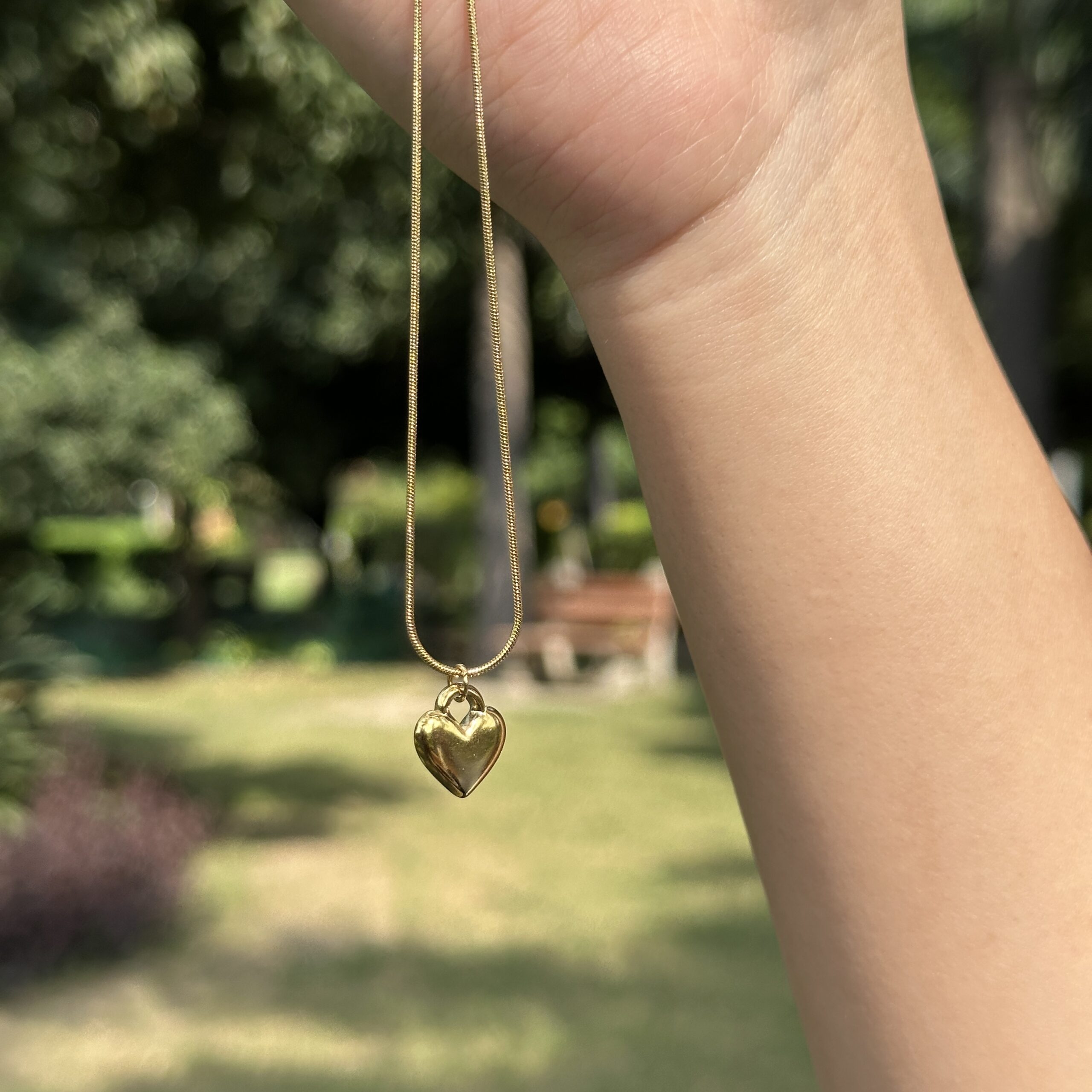 - Sculpted puff-heart pendant with gently rounded contours and a high-polish, warm-tone metal finish.