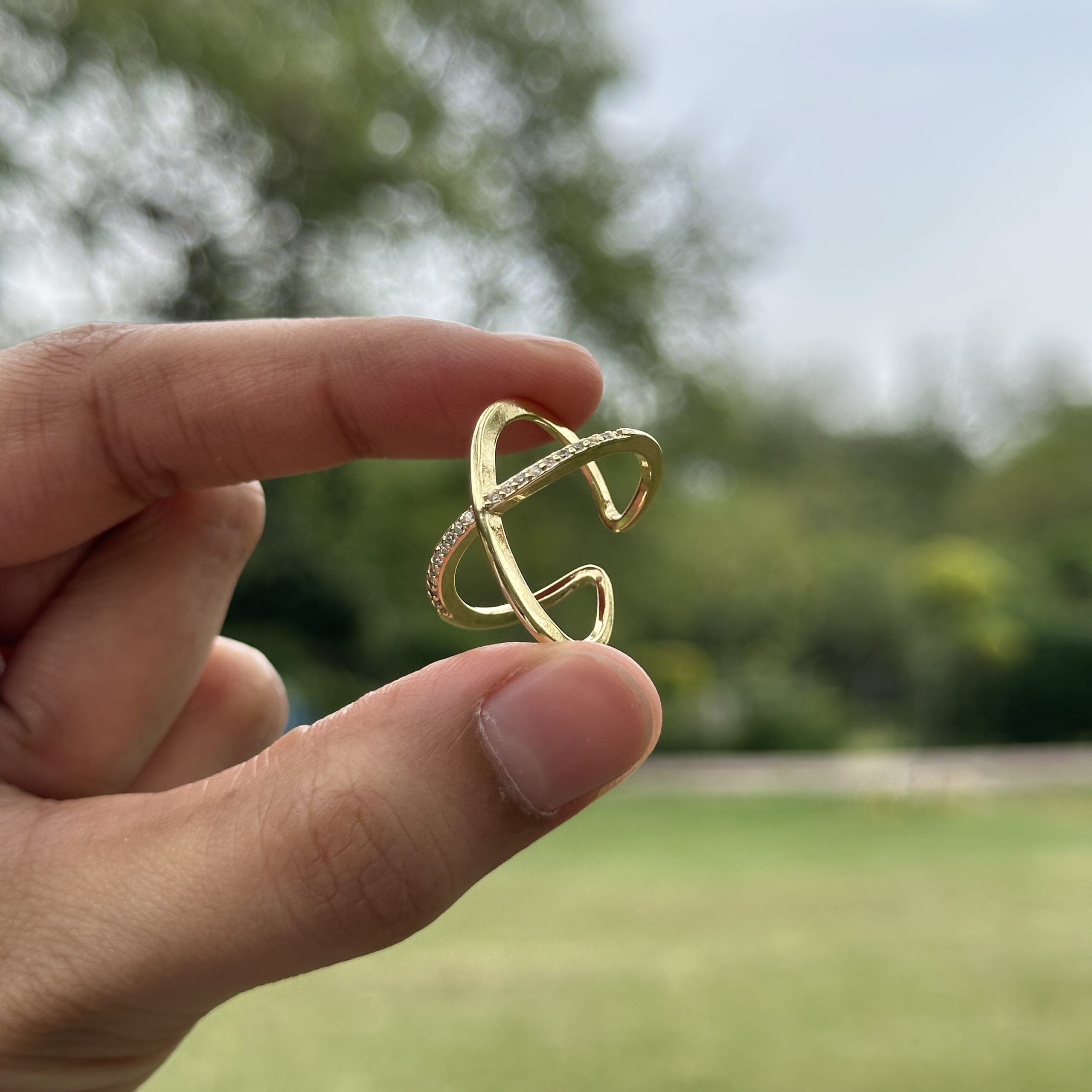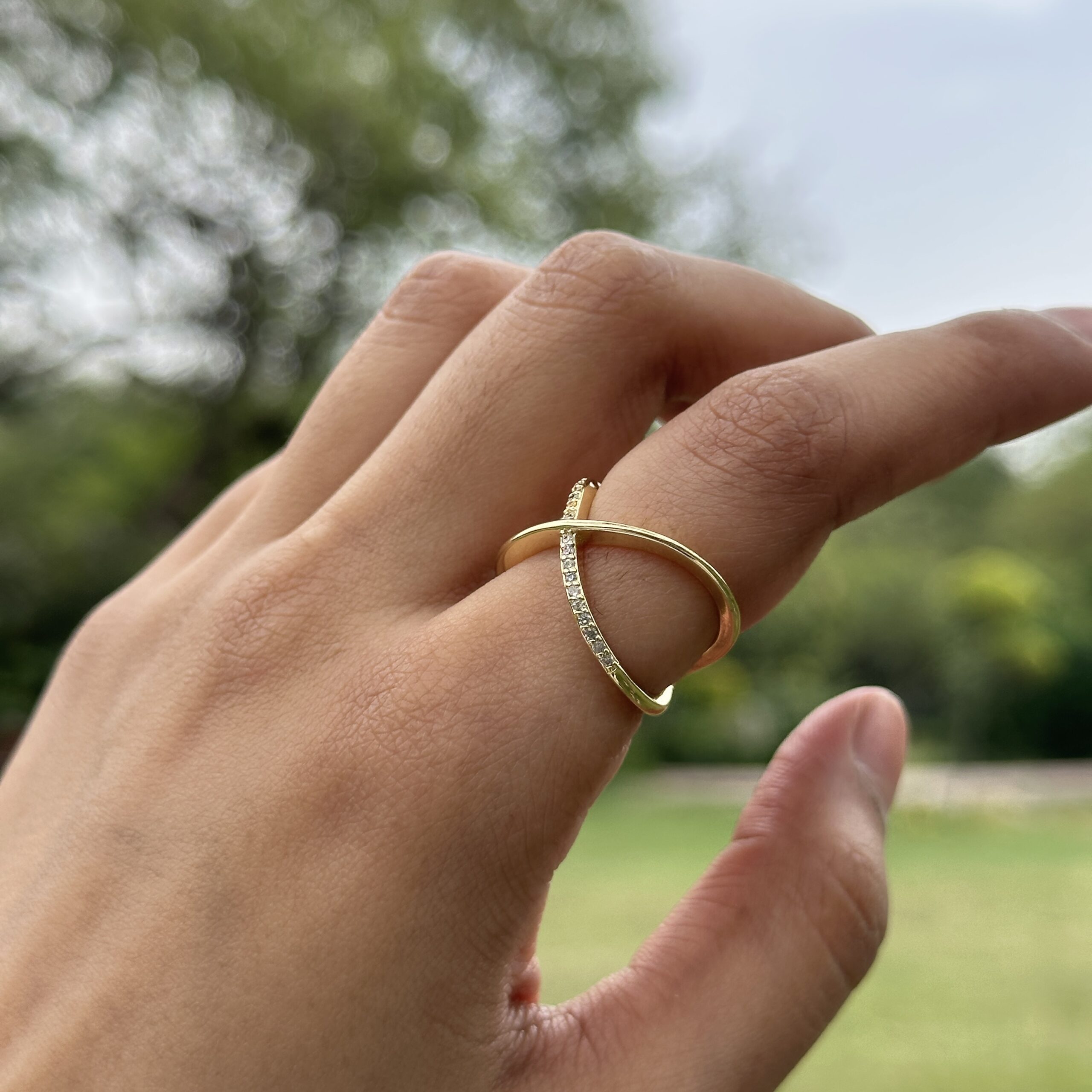 A sleek anti-tarnish ring designed with intersecting bands that create a modern crossover silhouette. One band remains smooth and polished, while the other is delicately lined with fine stones, adding a subtle shimmer without overpowering the design. The open, airy structure gives it a lightweight feel while still making a refined statement, perfect for everyday wear or stacking with other minimal pieces, and pairs effortlessly with both casual looks and more polished outfits when you want something understated yet distinctive.