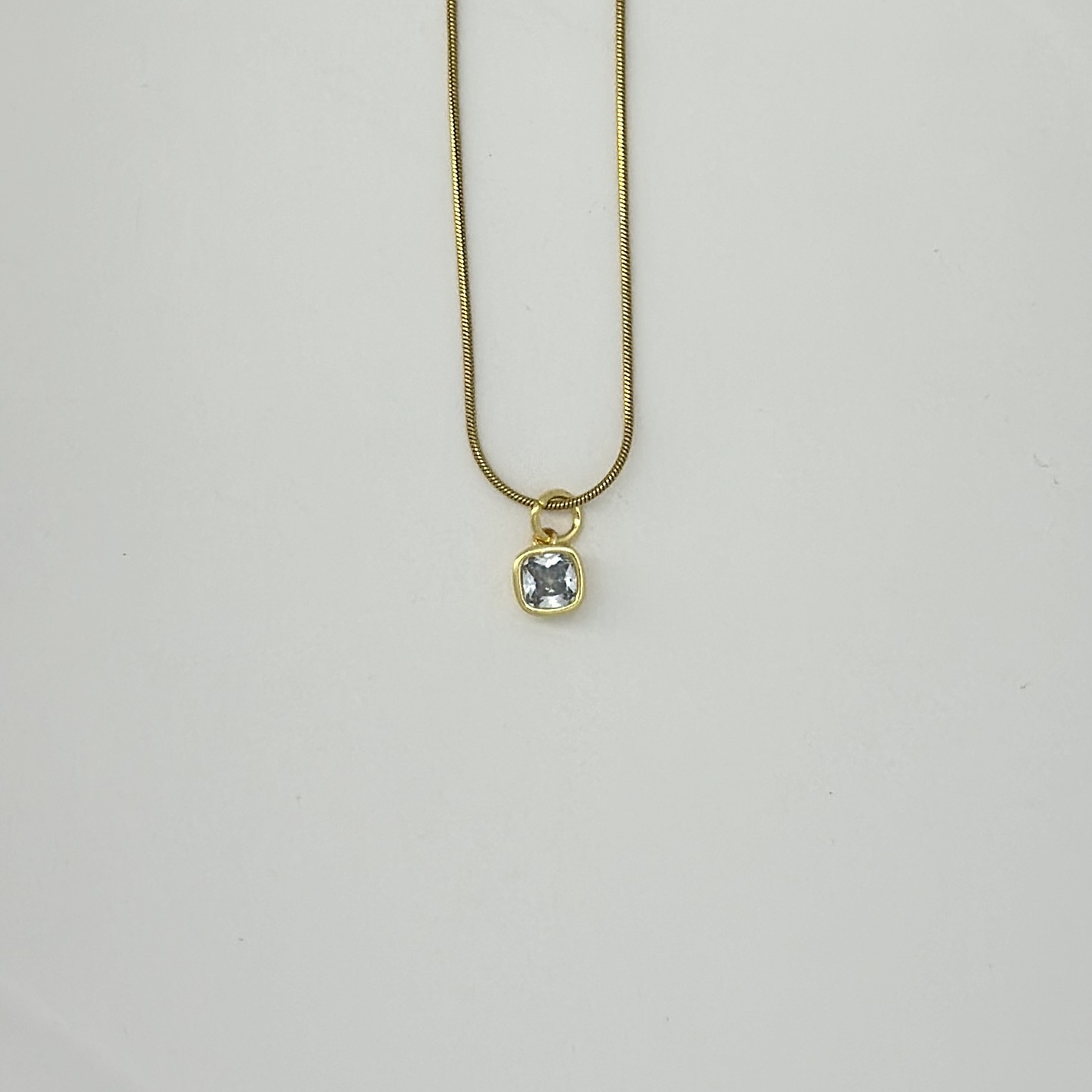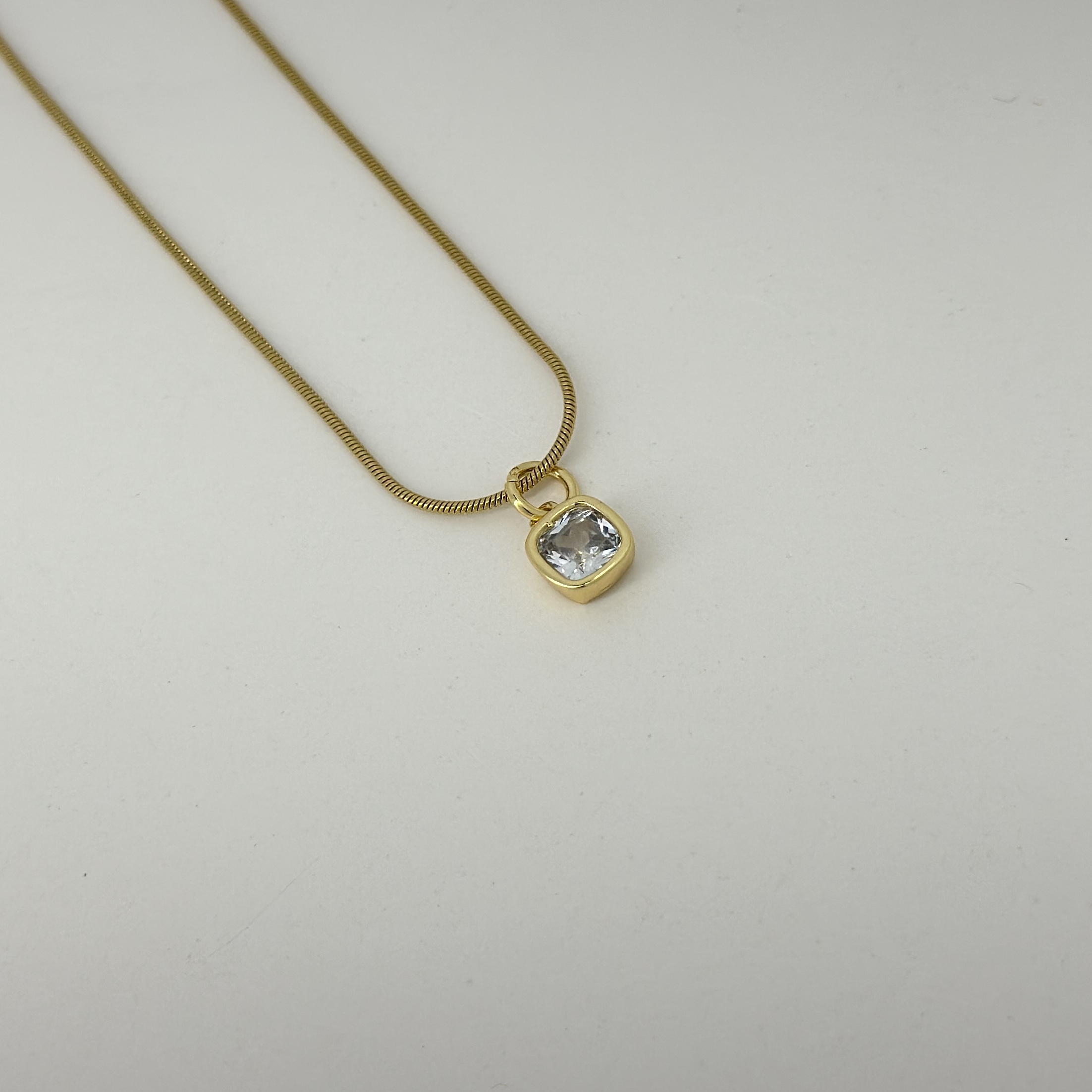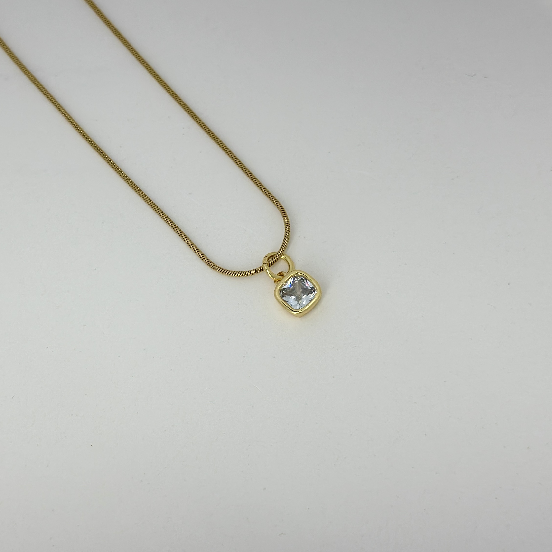 A soft square pendant with clean edges and a bright, glassy center, the Cushion Bezel Necklace is minimal, luminous, and easy to wear every day. The cushion-cut stone sits in a smooth bezel that frames the facets and keeps the profile sleek from every angle. Draped from a slim snake chain, the pendant rests neatly at the collarbone and moves with a gentle fluidity that feels modern and refined. Finished with an anti-tarnish surface to help maintain its shine, this cushion bezel pendant necklace is the kind of simple statement that works for workdays, weekends, and last-minute plans.