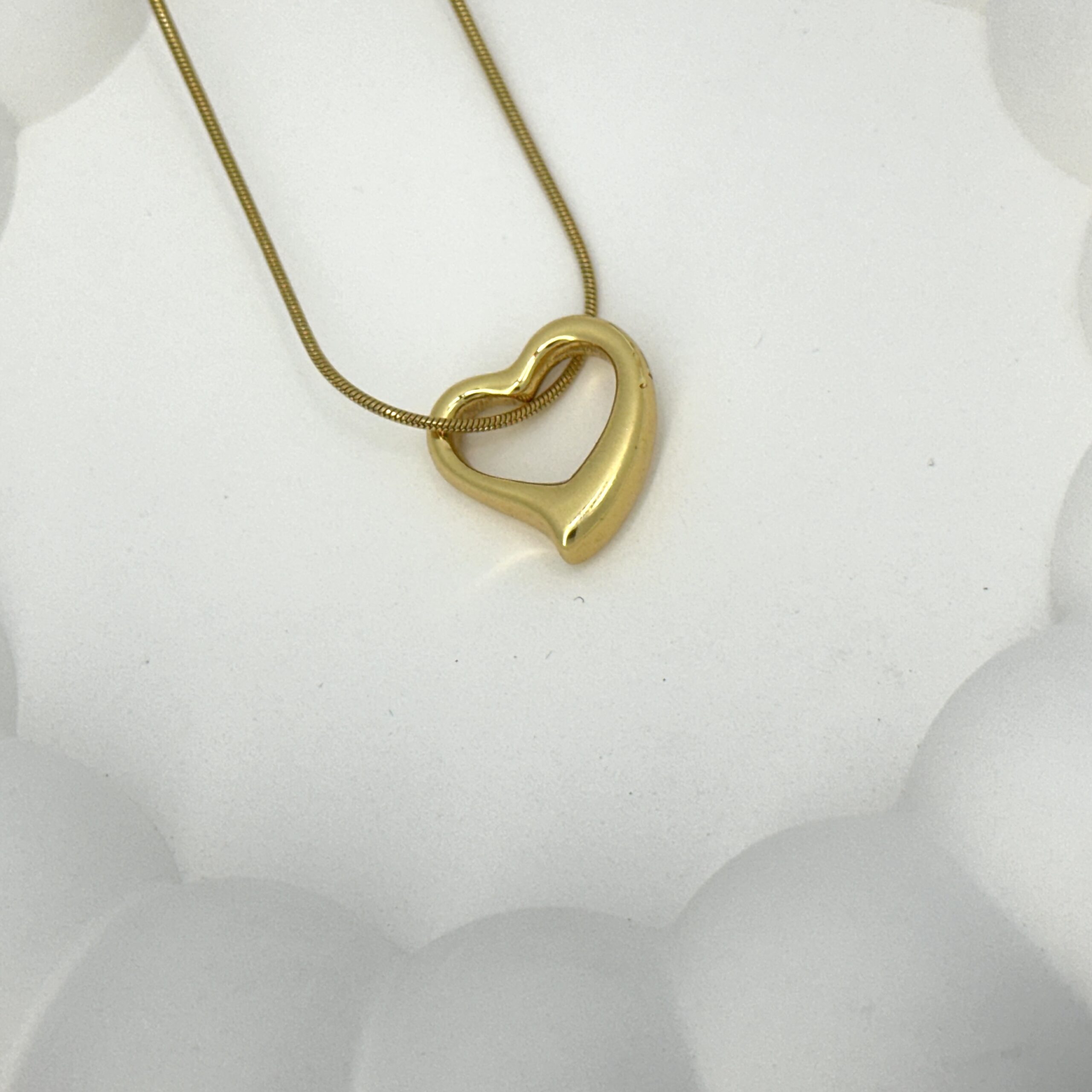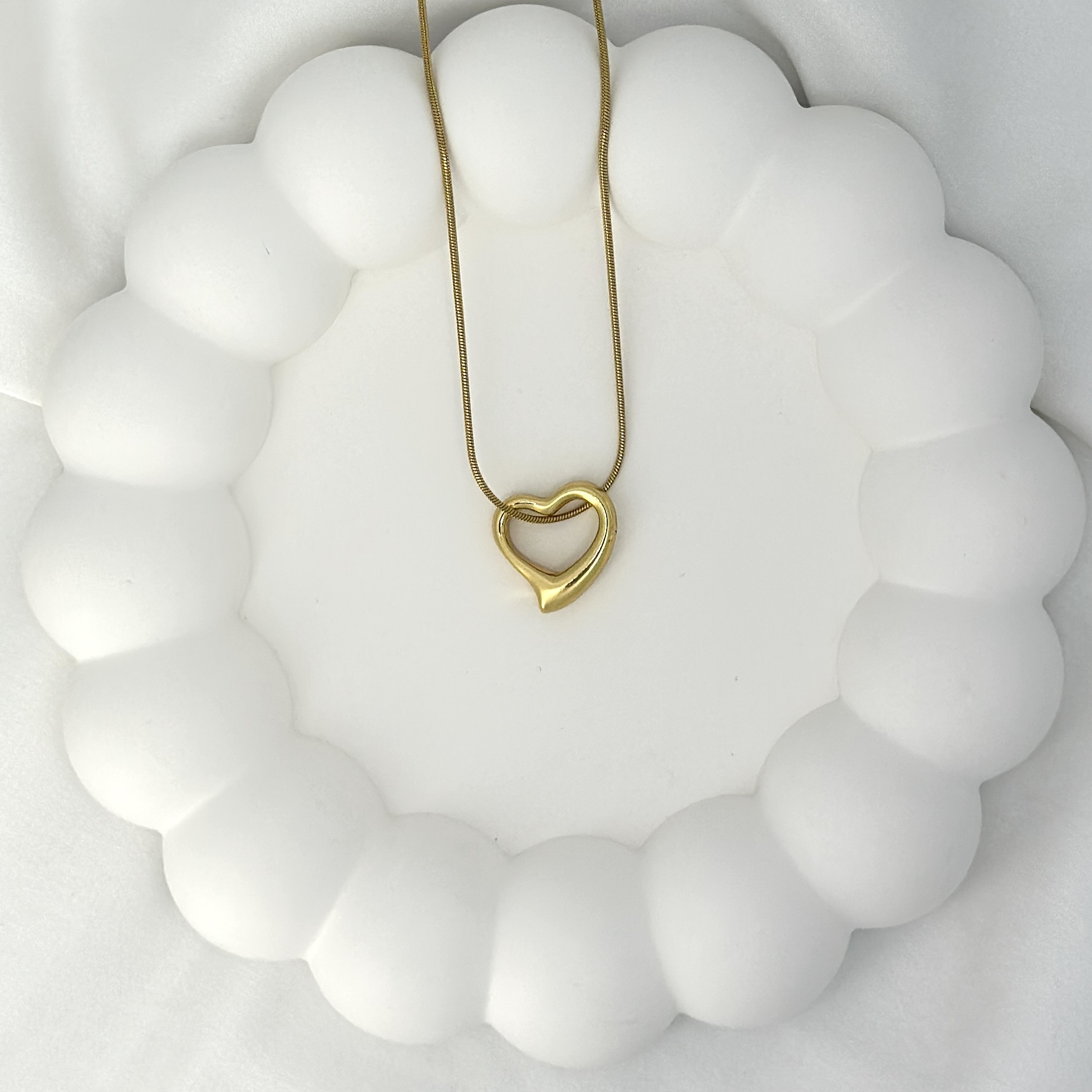 An open, fluid heart rendered in a single, sculpted sweep, the Drift Heart Necklace reads as modern and unexpectedly soft at once. The pendant’s asymmetric silhouette has a gentle inward curl that gives it personality from every angle; its polished surface reflects light in quiet flashes, emphasizing the piece’s smooth, tactile curves. Because the heart is hollow and low-profile, the overall effect is airy rather than heavy, a minimalist symbol made warm by its organic shape. Suspended on a slim, snake-style chain, the pendant sits close to the throat and moves naturally with the wearer, offering a subtle focal point that’s easy to wear day after day. The design translates well across styles: it feels clean and architectural with tailored pieces, and quietly romantic with softer, feminine silhouettes. Finished with a protective anti-tarnish coating, the Drift Heart keeps its luminous presence through regular wear without calling attention to the treatment.