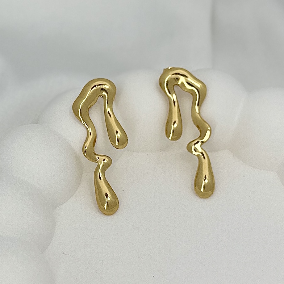 Dripfall Earrings are a sculptural study in motion, a soft, organic top that appears to have pooled and then given way to a series of liquid droplets, each one elongated into a graceful teardrop. The pair reads like molten metal frozen mid-fall: smooth, reflective surfaces catch light across every curve while the slightly irregular, hand-formed silhouette gives each earring an artisan, one-of-a-kind feel. Despite the dramatic, pendant-like movement, the design is balanced so it wears surprisingly light and sits comfortably at the lobe before unfurling into a longer, rhythmic drop. The polished finish amplifies the flowing shapes, creating subtle flashes of shine as you move. Finished with a discreet anti-tarnish layer, they keep their freshly-polished look with minimal fuss.