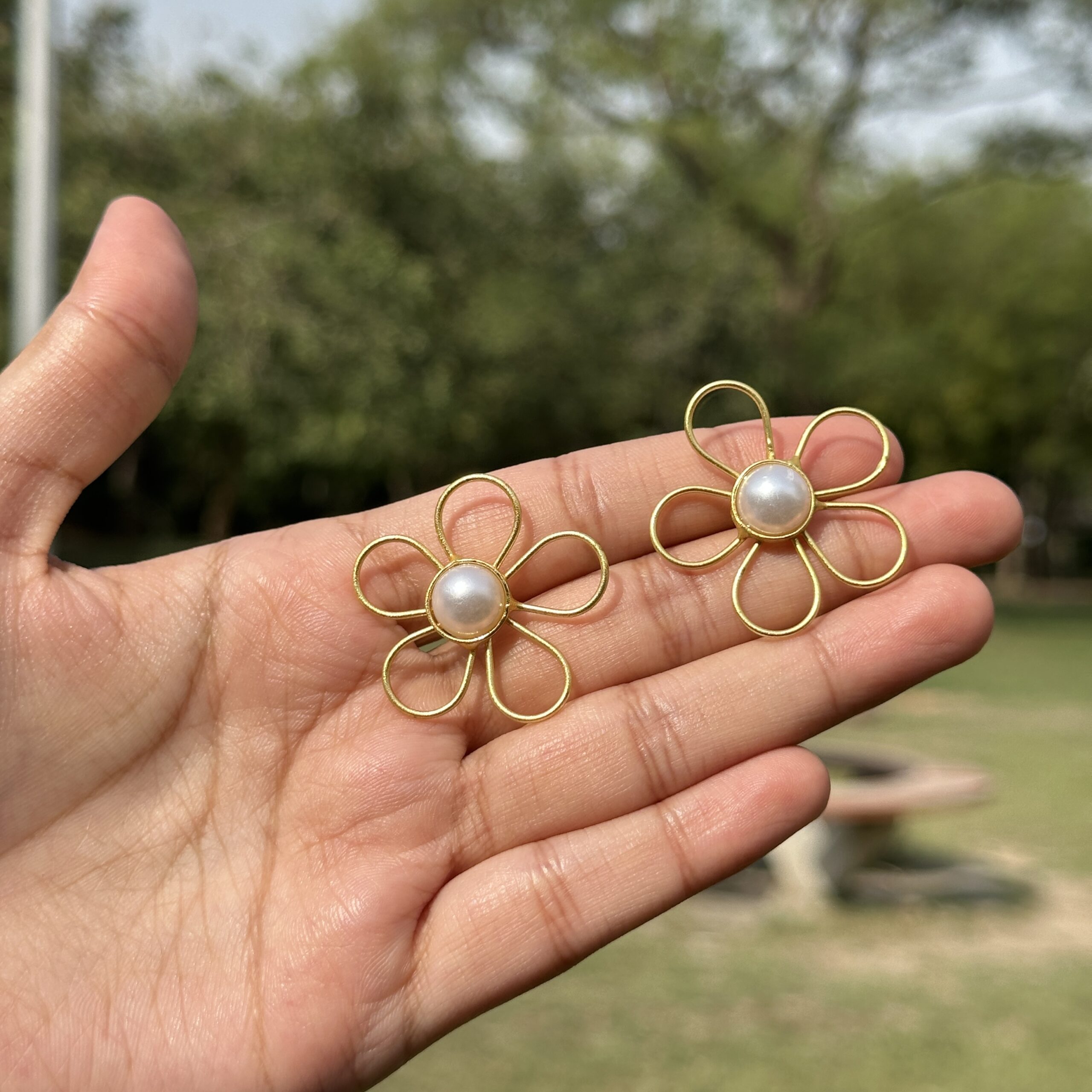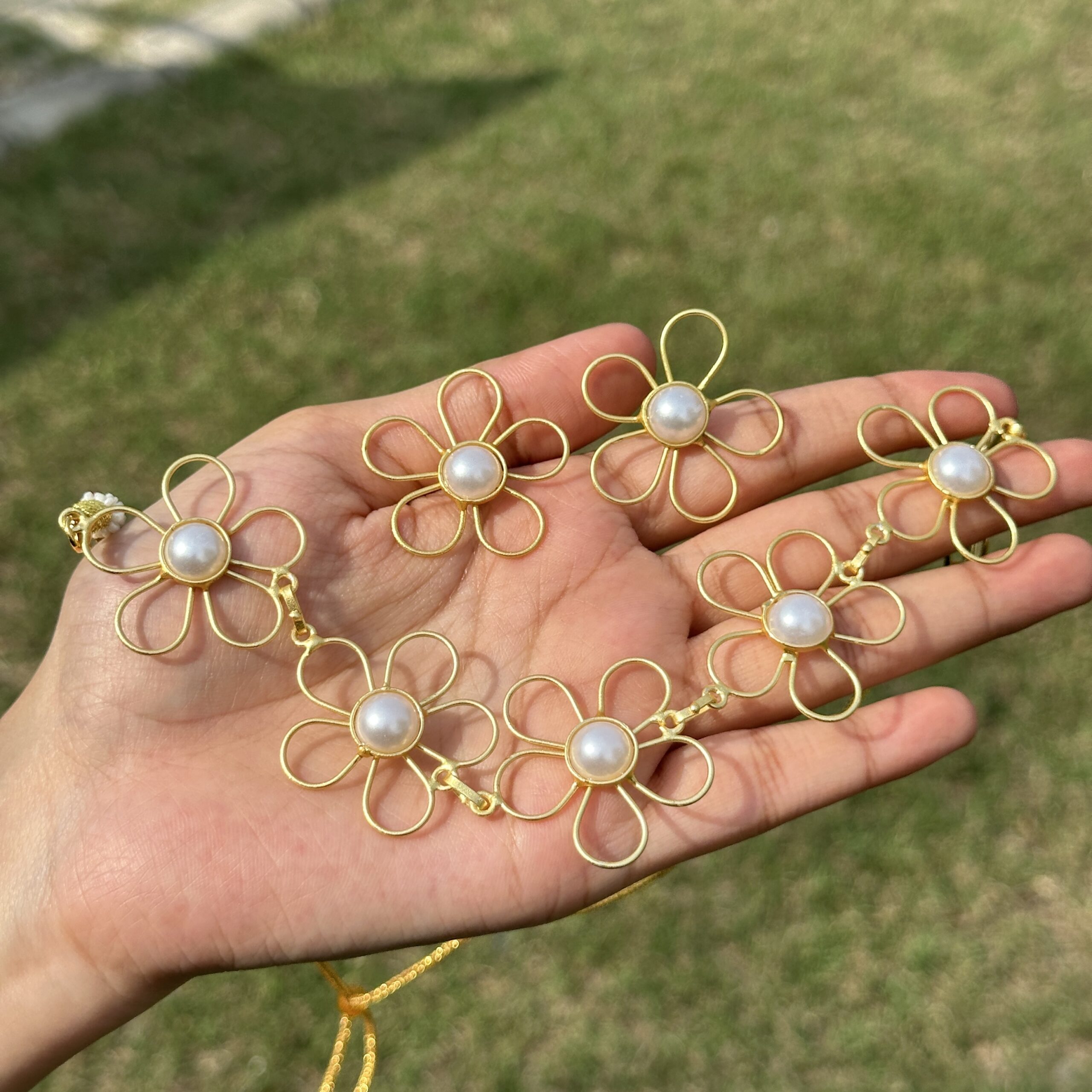 This Jaipuri jewelry set, crafted in a gold-toned brass base, features a delicate arrangement of floral motifs paired with soft pearl centers, creating a look that is both graceful and effortlessly charming. The open petal design gives it a light, airy feel, while the pearls add a touch of timeless elegance. Inspired by traditional Jaipur craftsmanship yet designed for modern wear, this set balances simplicity beautifully with a statement. Perfect for coordinated styling, it can be worn together for a complete look or styled separately for versatility. Pair it with soft pastels, cotton fabrics, or even minimal western outfits to add a subtle, feminine finish.
