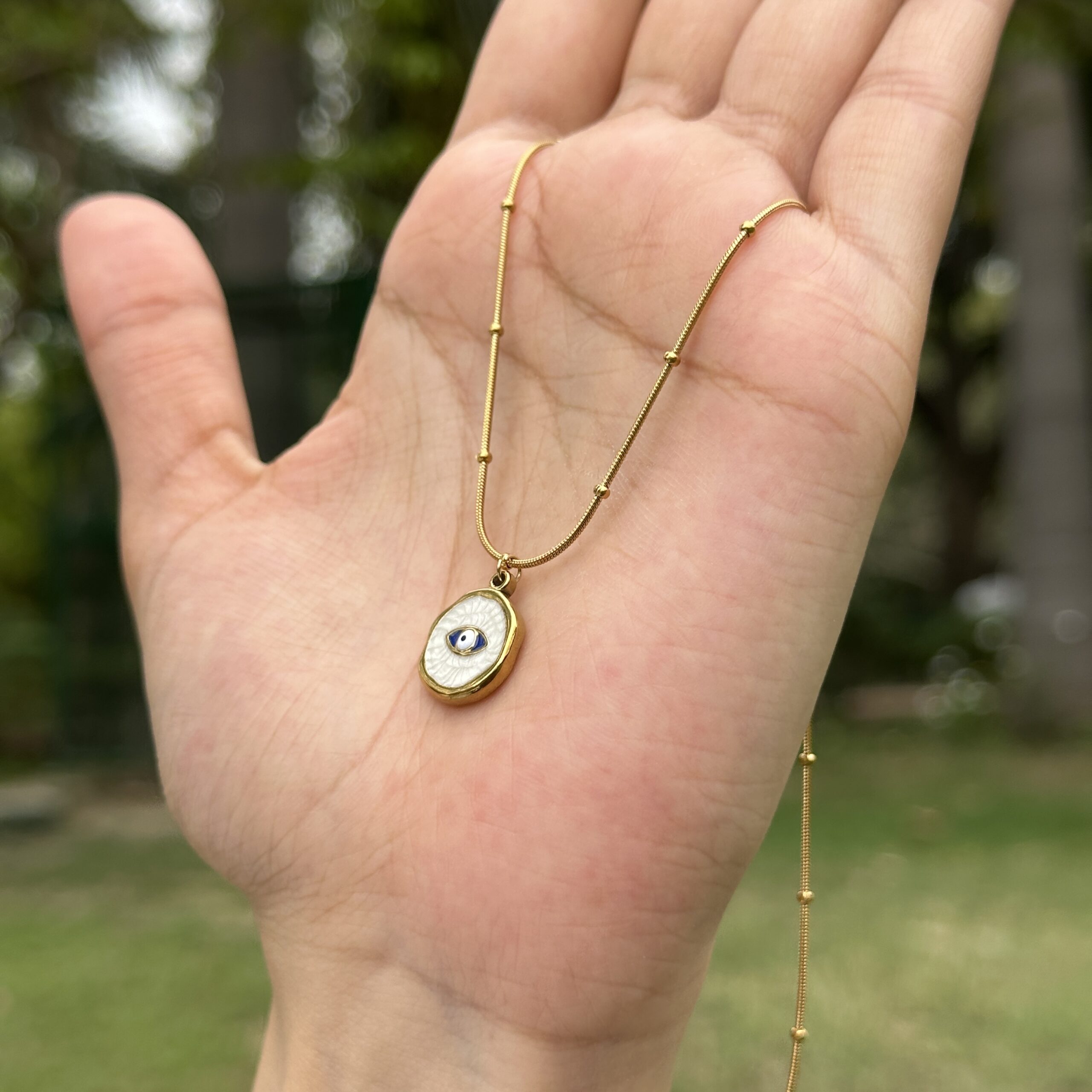 A timeless anti-tarnish necklace featuring the classic evil eye motif, designed to blend meaning with modern style. At its center, the eye is detailed with a subtle stone accent, adding a gentle sparkle while symbolizing protection and positive energy. The sleek, minimal design makes it perfect for everyday wear, whether worn alone or layered with other pieces. Finished with an adjustable chain for a customized fit, this necklace is both stylish and symbolic, an effortless addition to your daily jewelry stack.