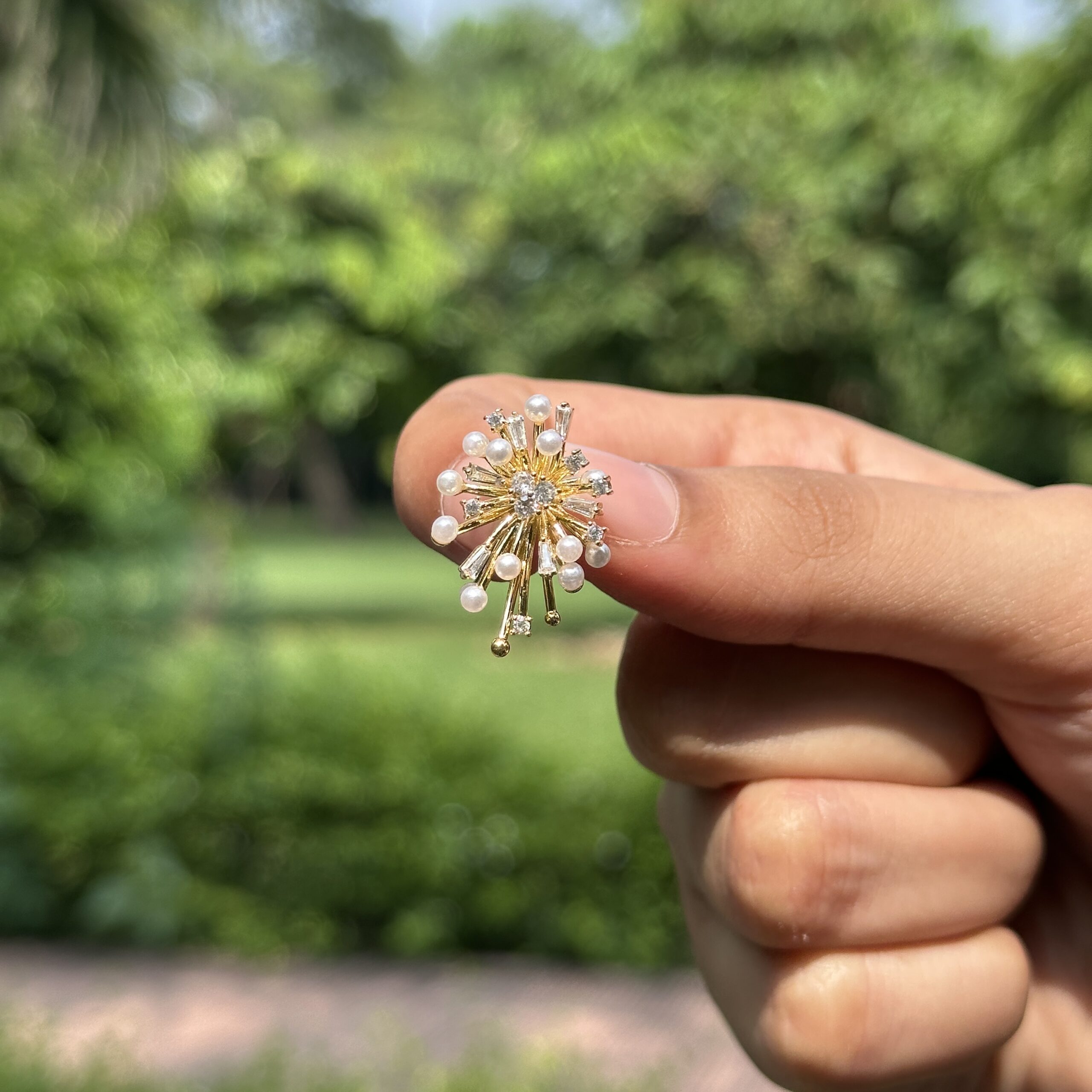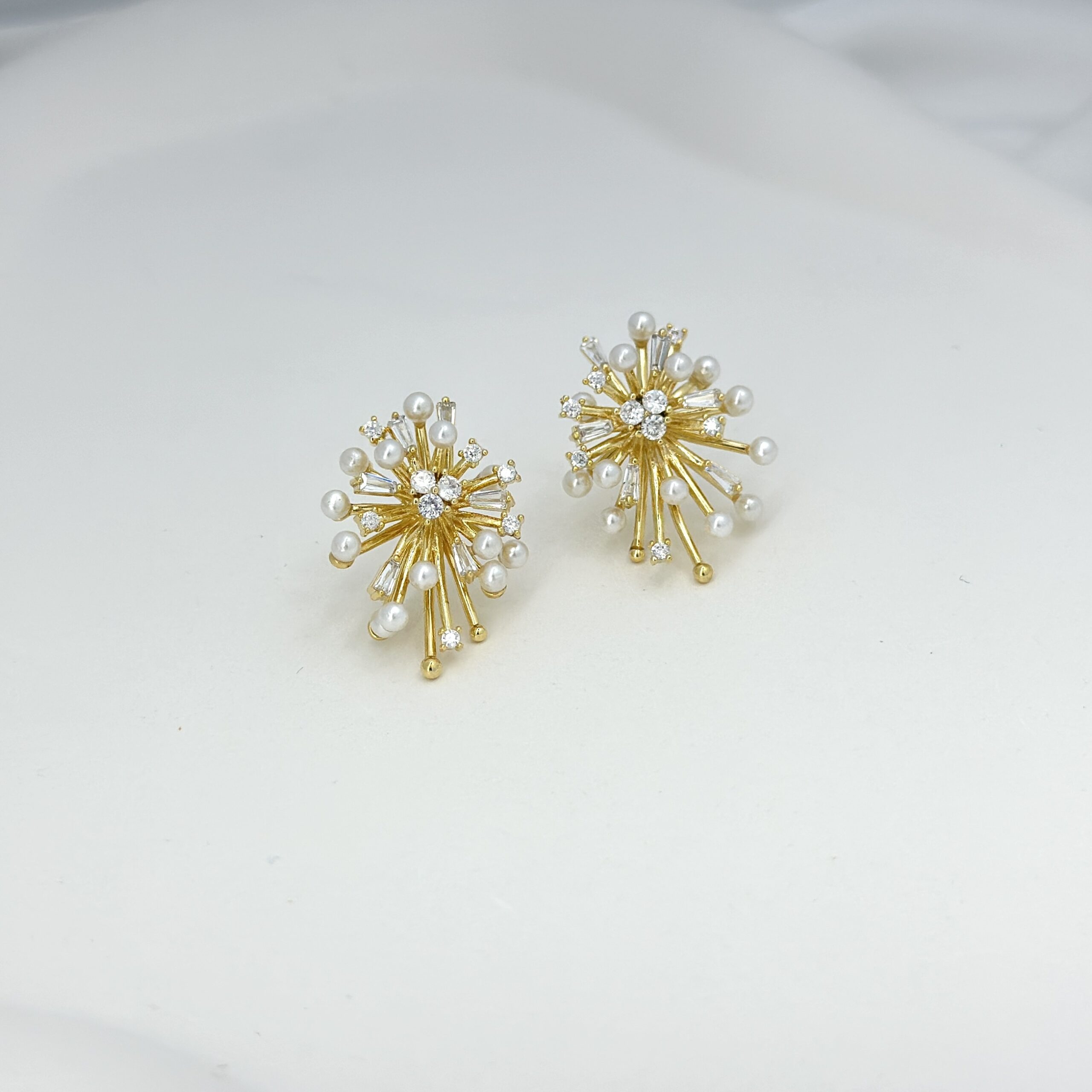 Firework Earrings pair concentrated cubic zirconia / AD brilliance with delicate pearl accents to create a lively, couture-ready stud. A brilliant-cut centre stone anchors a burst of fine gold-tone pins set with mixed-cut baguette and round cubic zirconia / AD stones, while tiny pearl beads crown several pin tips for a soft, luminous contrast. The result is a radiant, three-dimensional cluster that reads as both statement and refined detail, perfect as bridal cubic zirconia earrings or elevated everyday studs. The compact silhouette sits slightly over the lobe for confident scale without feeling heavy, and the warm plated finish with an anti-tarnish coating helps retain that showroom shine. Ideal search phrases to include on the product page: cubic zirconia cluster earrings, AD stone stud earrings, pearl cluster studs, bridal cubic zirconia earrings, women’s statement studs.