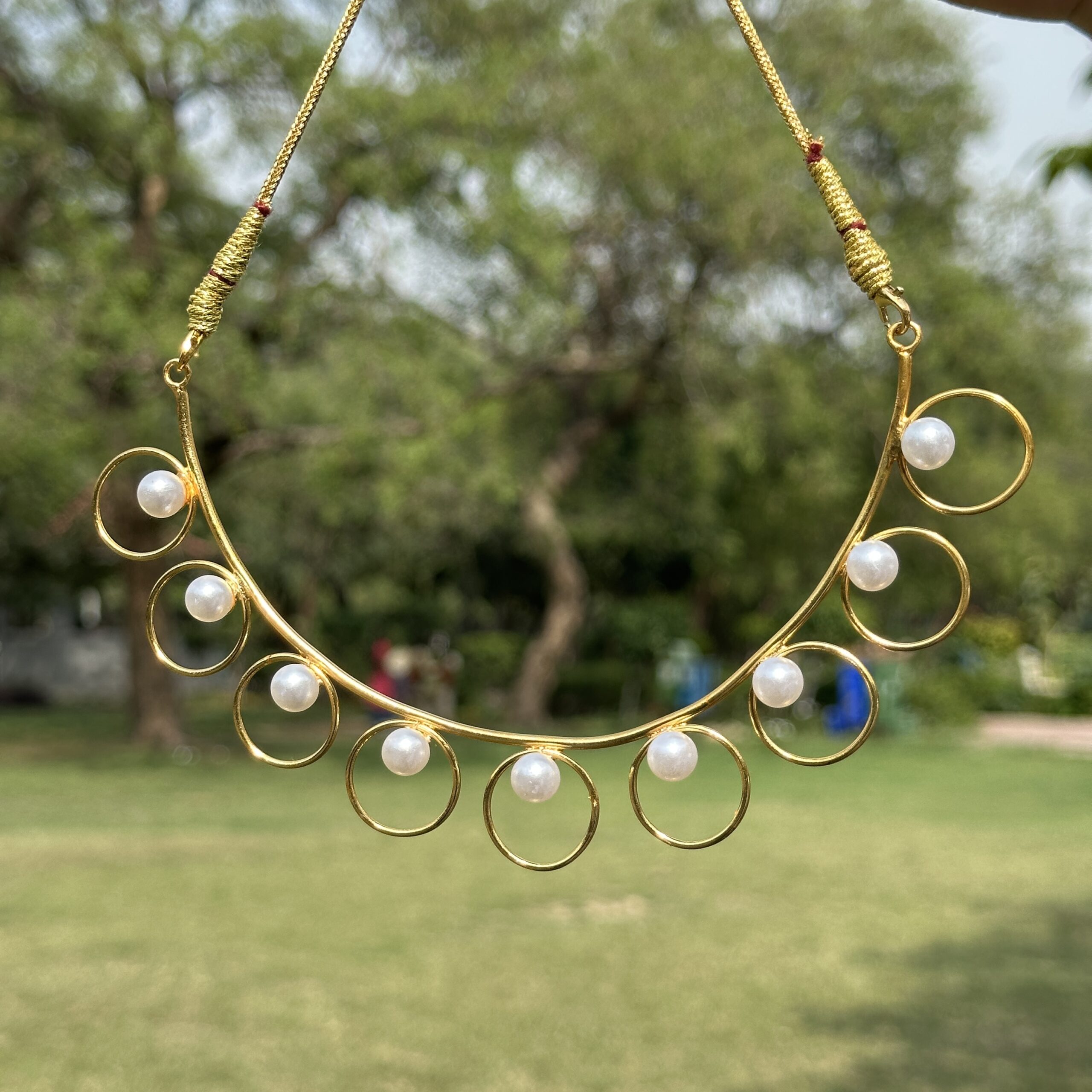 This elegant Jaipuri necklace and earrings set features a flowing curved design lined with delicate circular loops, each holding soft pearl accents that create a balanced and graceful look. Crafted on a rich gold-tone brass base, the piece reflects Jaipur’s signature handcrafted style with a clean, wearable finish. Made using semi-precious elements, the design carries a subtle richness, while the slightly raw, uncut-inspired texture adds to its artisanal charm. The repeating loop pattern gives it movement and structure at the same time, making it stand out without feeling heavy. Perfect for both festive and semi-formal wear, this set pairs beautifully with open necklines or solid-coloured outfits, allowing the circular detailing to stand out, and can also be styled with minimal clothing to let the design become the main highlight of your look.