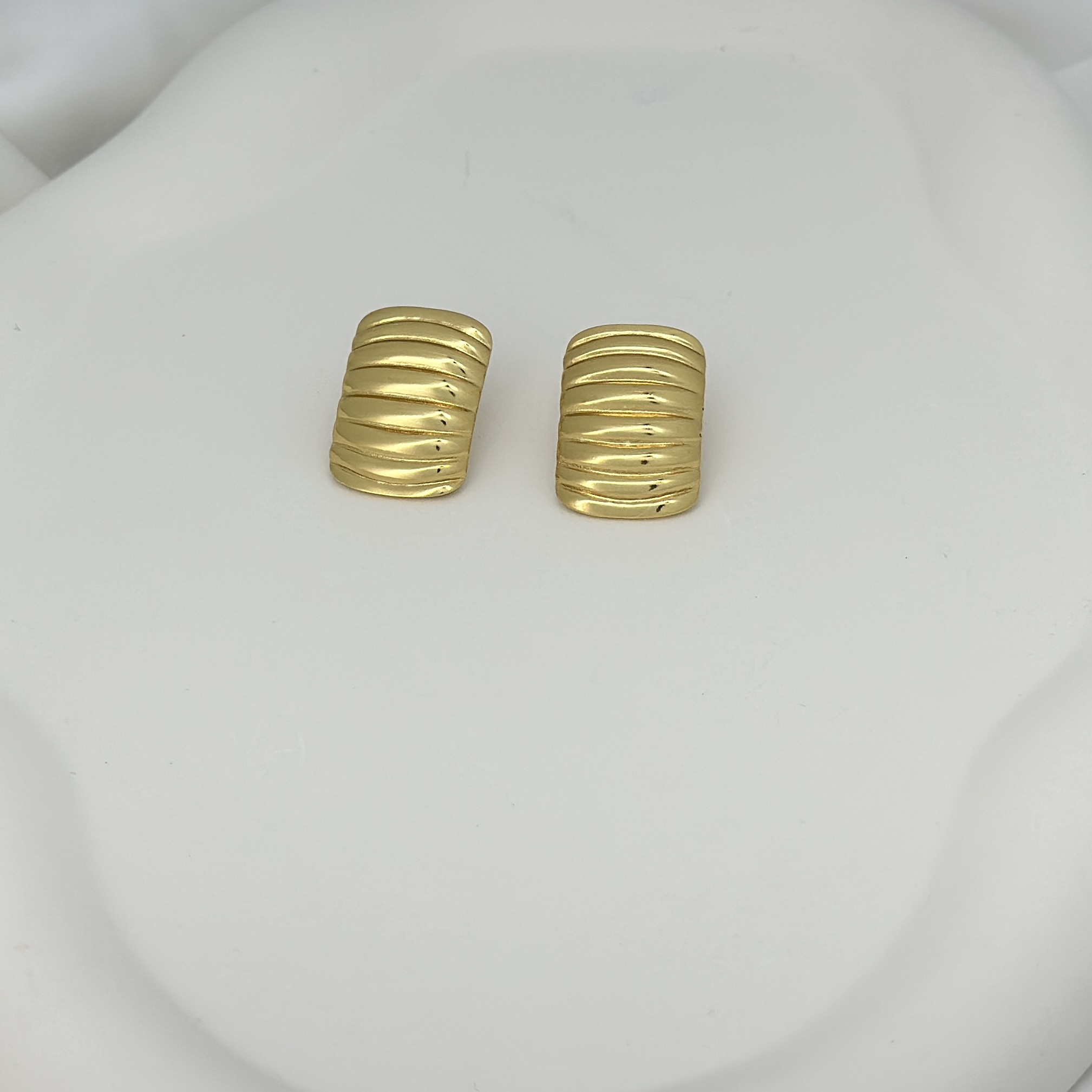 - Sculpted ribbed profile for architectural texture and reflective shine, a modern take on stud earrings.