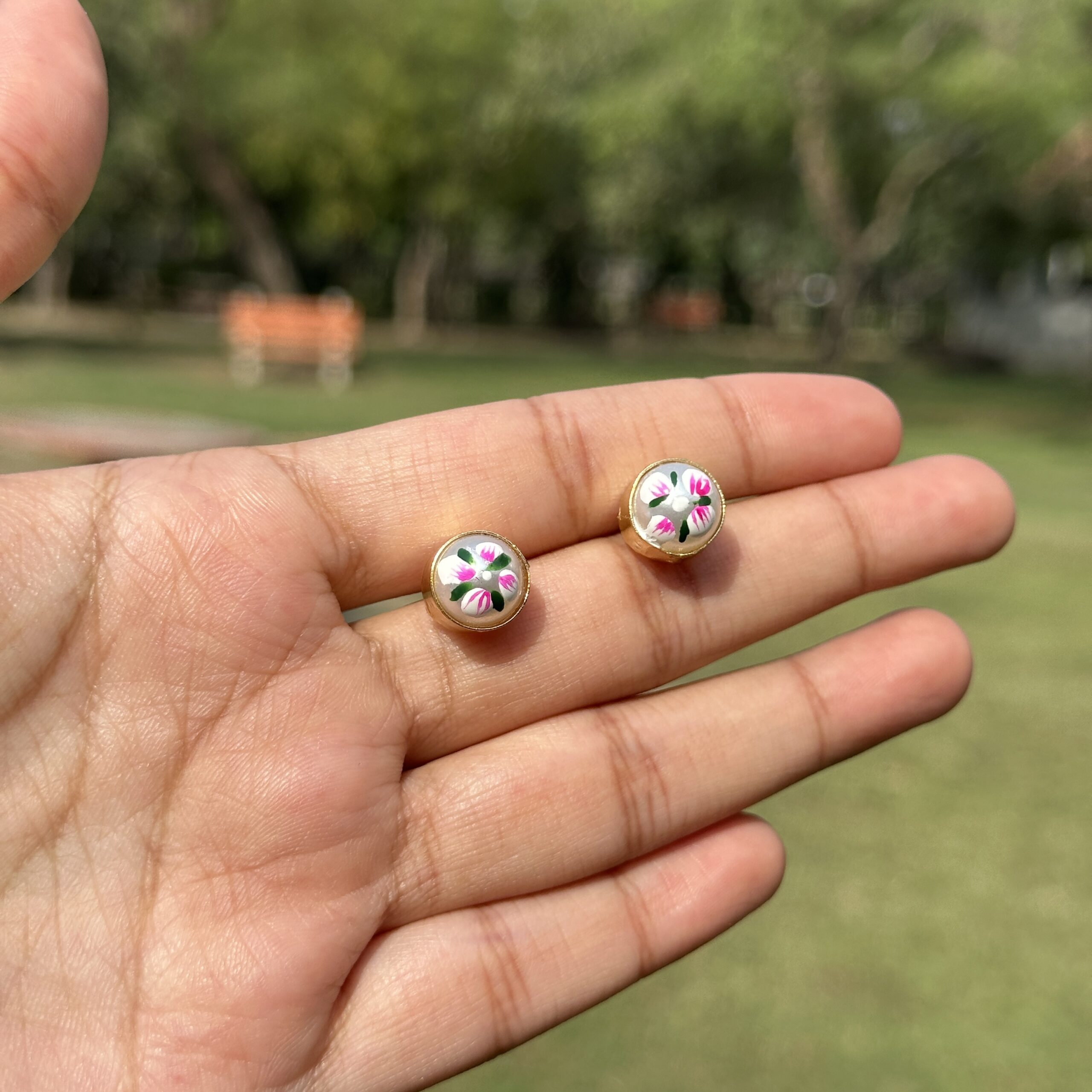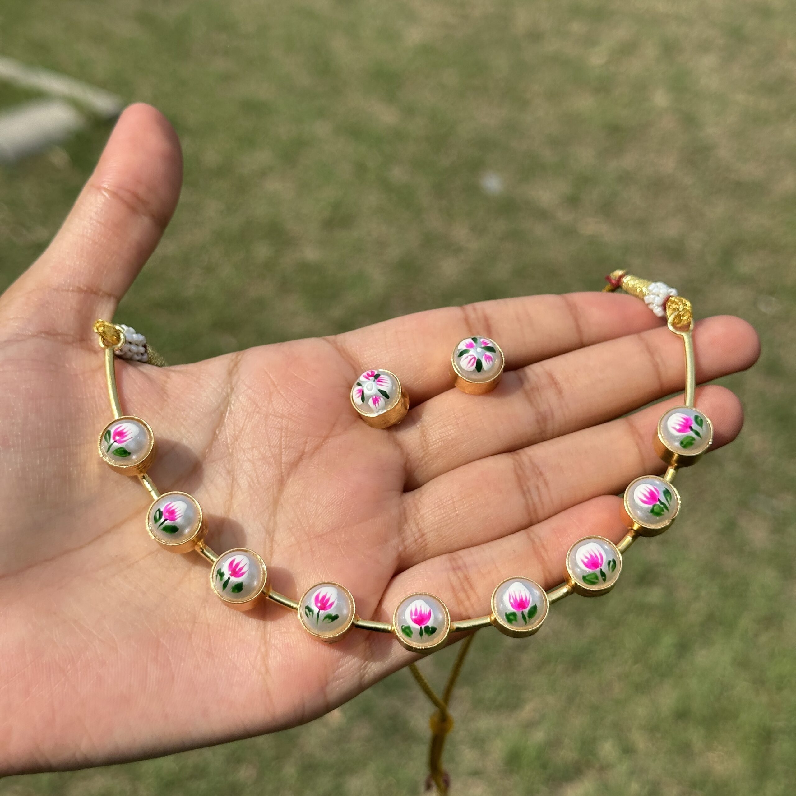 inspired by traditional Jaipur miniature art. Each piece is detailed with soft enamel work that reflects the beauty of lotus-like blooms, giving it an artisanal and heritage-rich feel. The fine craftsmanship and subtle colors make it lightweight yet visually striking, perfect for those who appreciate intricate design. Blending traditional technique with easy wearability, this set can be styled together for a coordinated look or worn separately, pair it with ethnic wear like kurtas or sarees, or even a simple solid outfit to let the hand-painted detailing stand out beautifully.