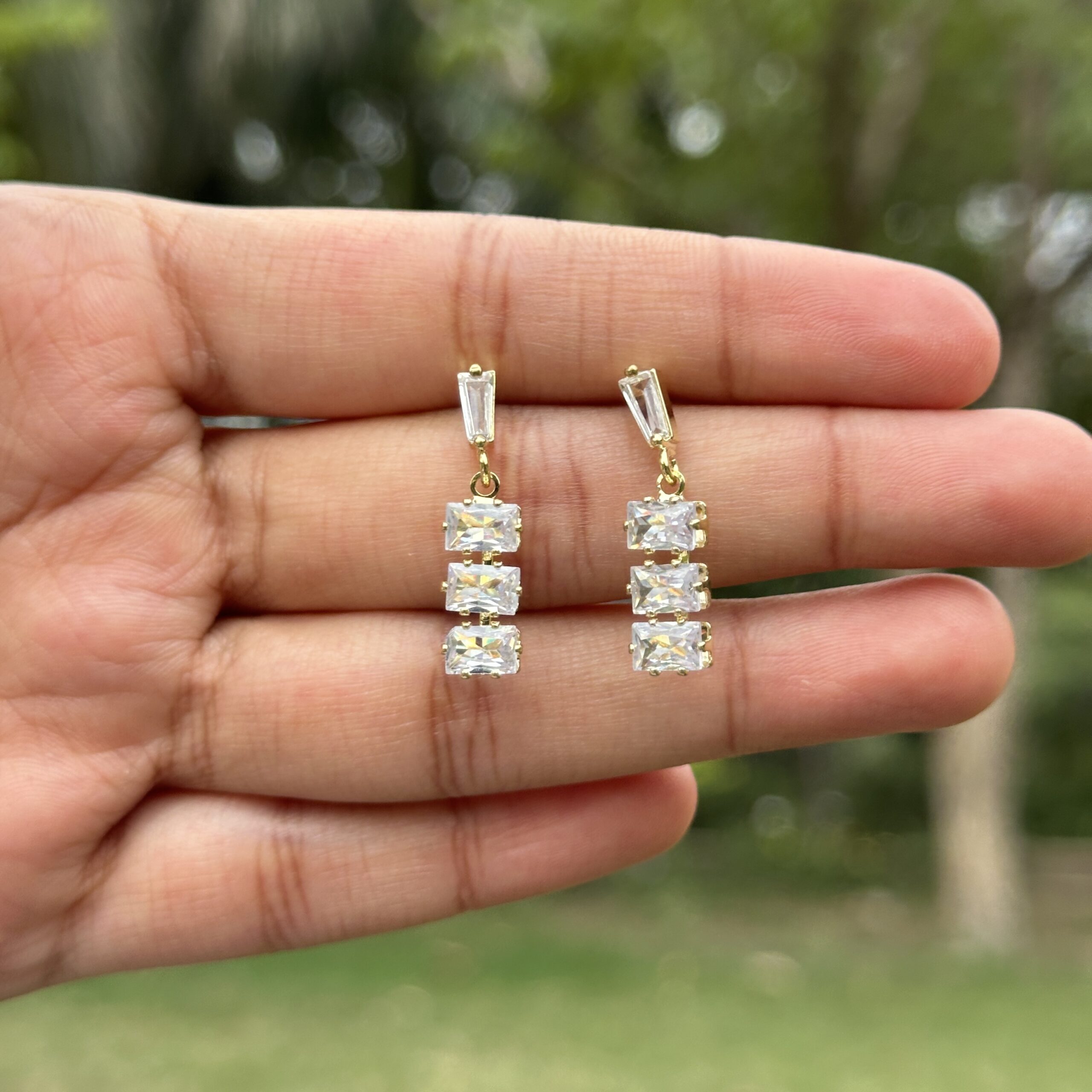 Sleek, refined, and effortlessly eye-catching, these drop earrings feature a vertical arrangement of precision-cut rectangular stones that catch light from every angle. The structured, tiered design creates a graceful elongating effect, making them perfect for both minimal styling and elevated looks. Crafted with an anti-tarnish finish, they maintain their shine over time while staying lightweight and comfortable for all-day wear. The clean geometry paired with brilliant sparkle makes them a versatile staple for modern wardrobes. Pair these with a slick ponytail or tucked-behind-the-ear hair to highlight the vertical drop. They work beautifully with evening outfits, satin shirts, or even a crisp white shirt when you want a touch of subtle glam.