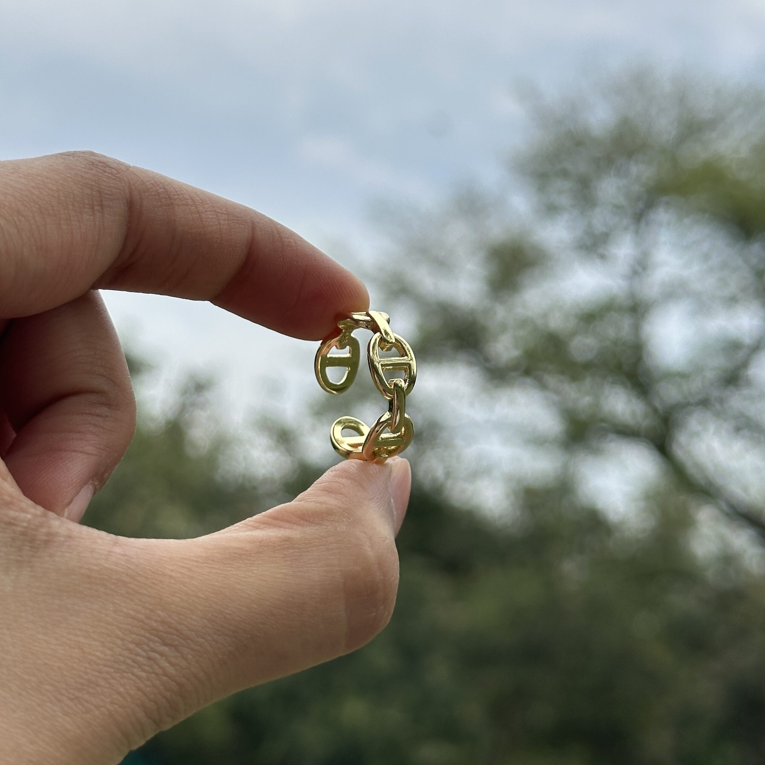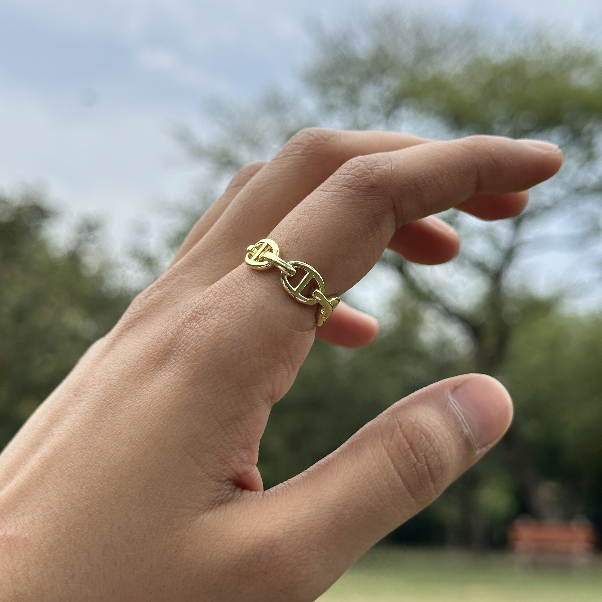 A ring designed with interlocking links that give it a connected, slightly bold look while still keeping things easy and wearable. It has a bit of an edge to it, but in a way that still feels effortless and not overdone. The linked design adds movement and detail, making it stand out without needing anything extra. Crafted with a stainless steel base and finished with an anti-tarnish coating, it’s made for everyday wear while maintaining its shine. Style it on its own for a clean statement or mix it with other rings to add a little texture to your stack.