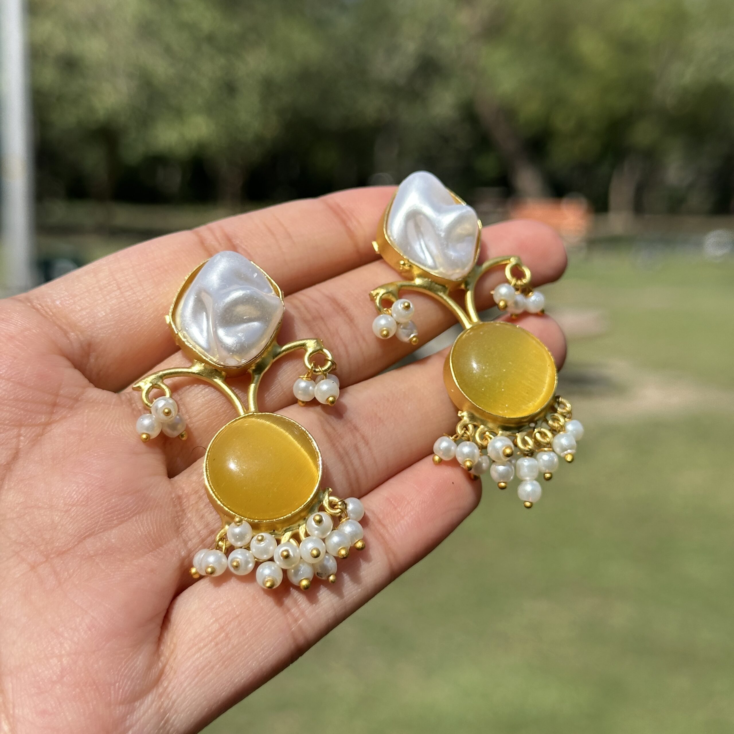 Crafted in a distinctive Jaipuri style, these statement earrings feature a beautiful blend of semi-precious and uncut stones, combining a soft organic top with a vibrant centre stone in a warm kesar hue. Set in brass with a rich gold-like finish, the design is further enhanced with delicate pearl drops that add graceful movement and a refined, festive charm. Each piece carries a slightly unique character due to the natural variation of semi-precious and uncut stones, making it feel more artisanal and one-of-a-kind. Rooted in traditional craftsmanship yet easy to style, these earrings bring effortless elegance to both occasion wear and elevated everyday looks. Pair them with warm-toned outfits like mustard, ivory, or soft, earthy shades, and style with tied-back hair or a low bun to let the detailing and pearl movement stand out beautifully.