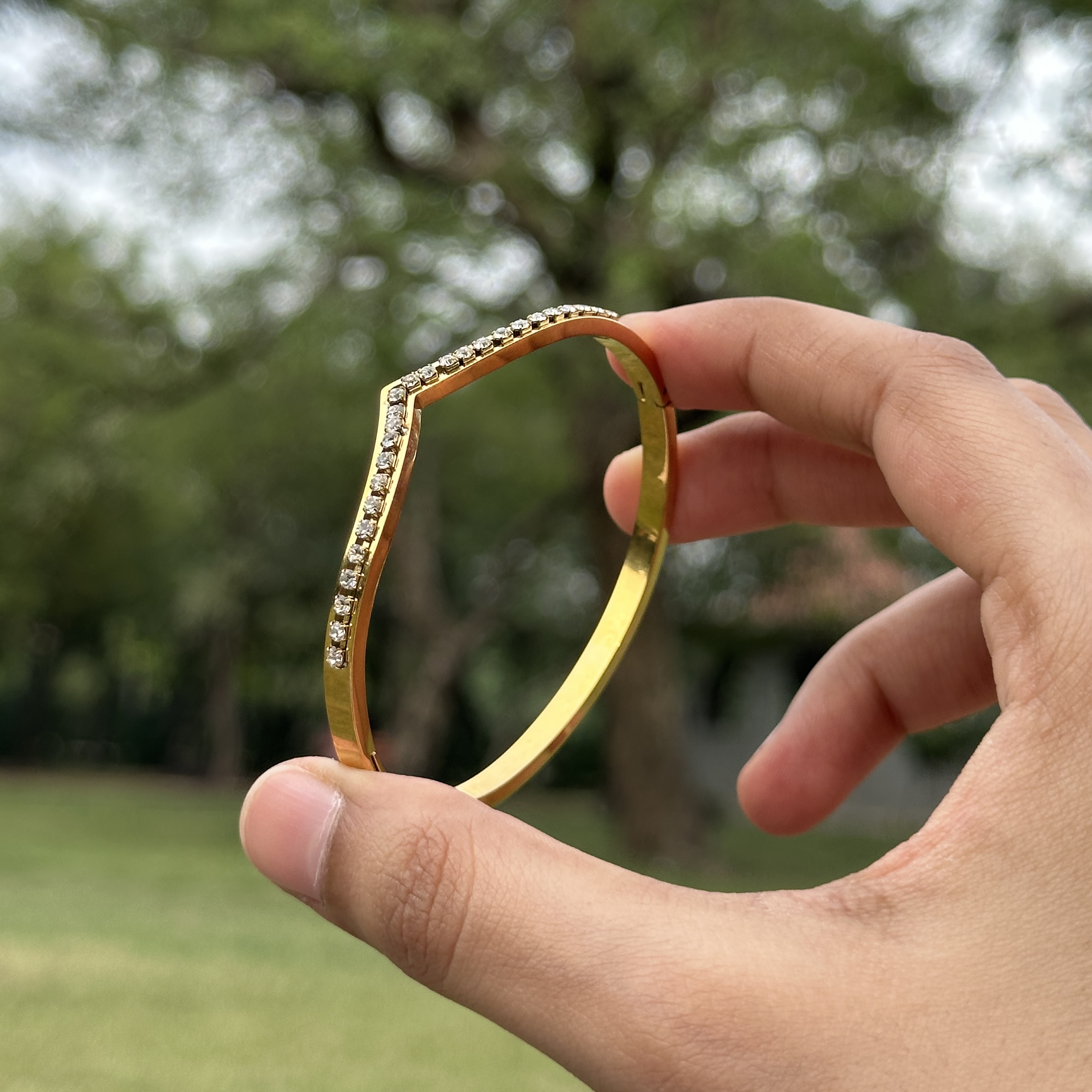 Designed with a subtle V-shaped front, this bracelet brings a sharp yet elegant structure to a classic rounded form. The front detail adds a modern edge, making it stand out while still keeping the overall look clean and wearable. Crafted with a durable anti-tarnish finish, it is made for long-lasting shine and everyday use without the worry of fading. The bracelet features an openable design, allowing it to slip on easily while maintaining a secure and comfortable fit. Perfect for both minimal and styled looks, this piece adds a refined touch to your wrist — wear it on its own for a sleek statement or pair it with other pieces for a more layered, elevated feel.