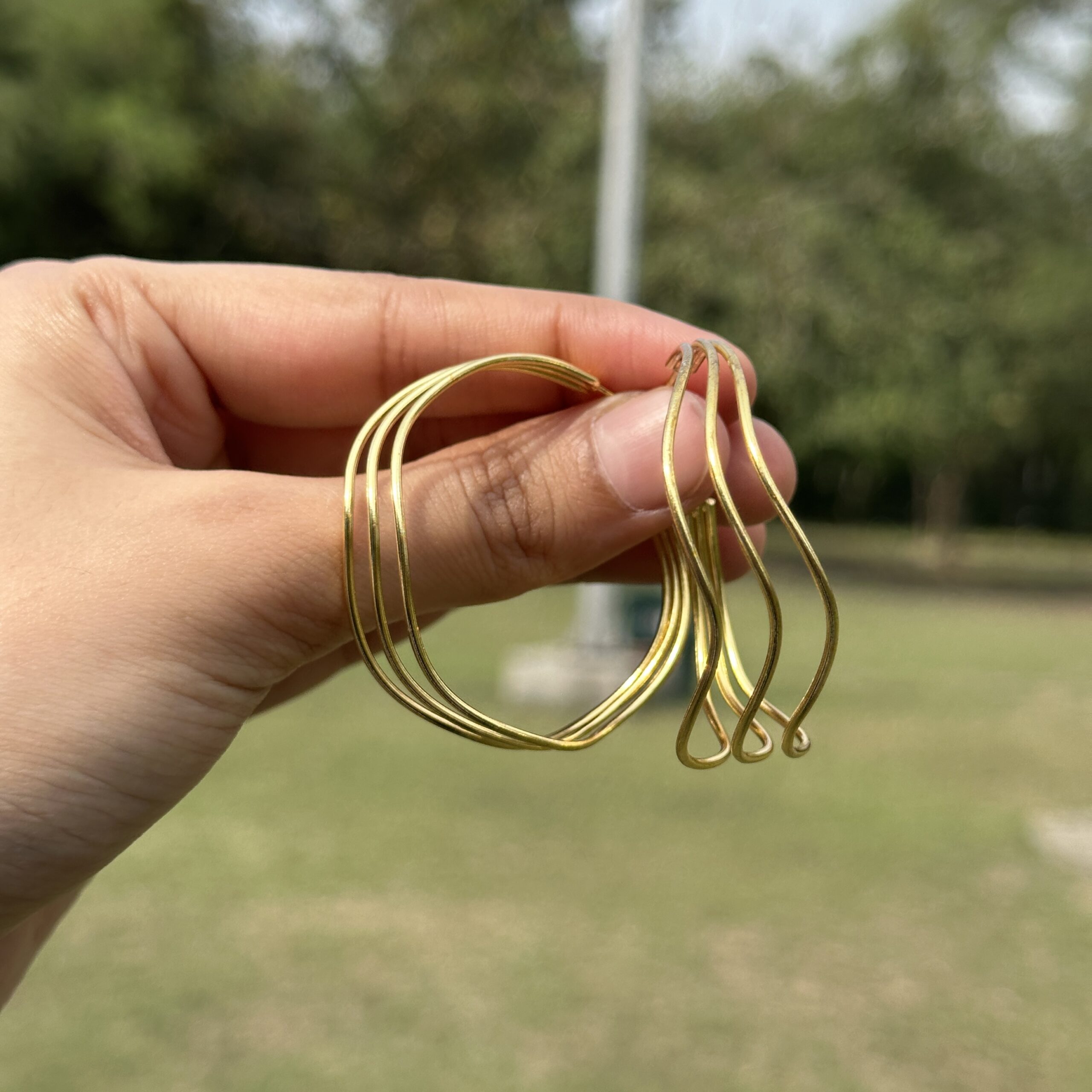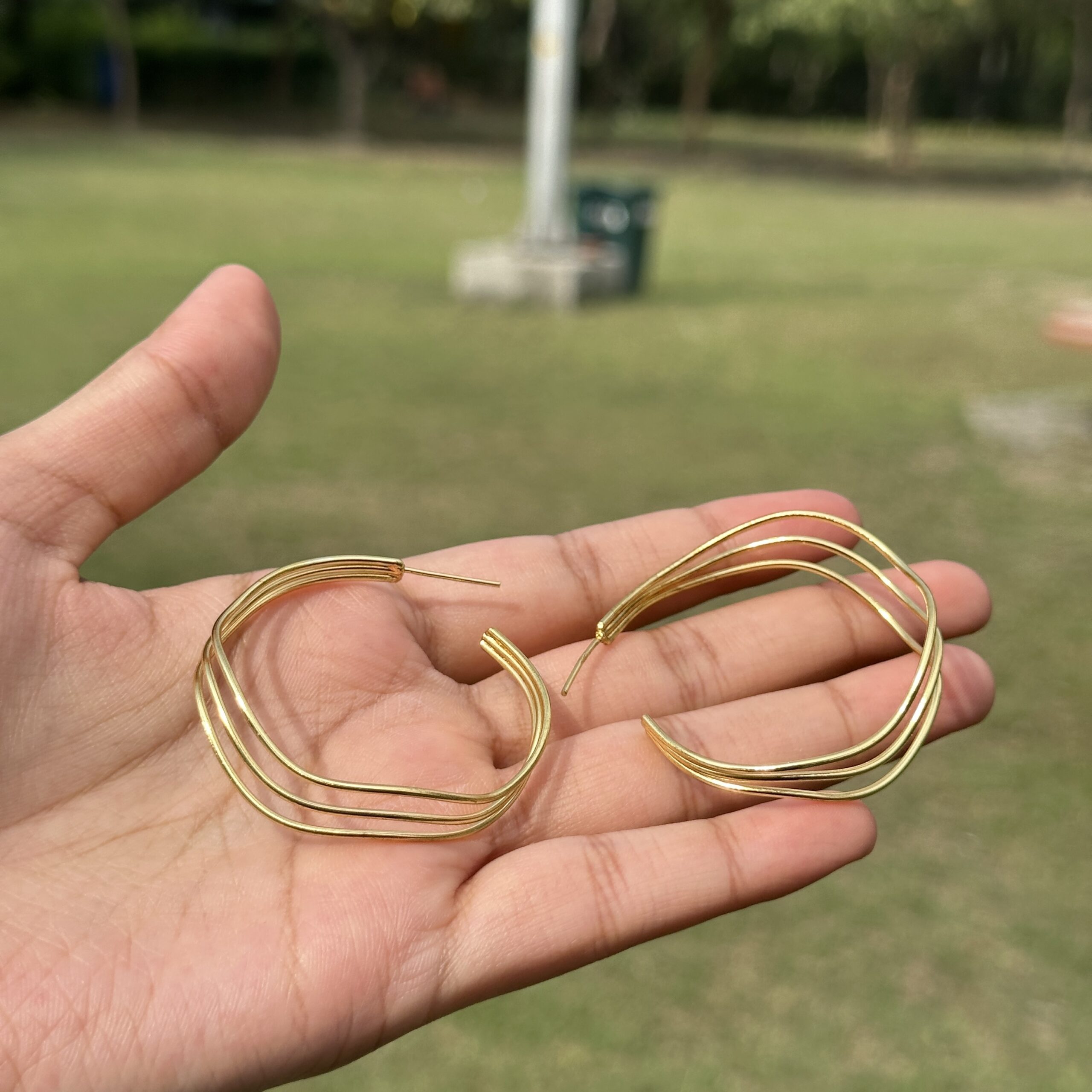 These Jaipuri hoops feature a clean, flowing design with multiple slim curves coming together to create a soft layered look. Crafted in brass with a rich gold-like finish, they reflect the simplicity of traditional Jaipur craftsmanship with a modern touch. The smooth, wavy lines give a sense of movement while keeping the design minimal and lightweight, making them perfect for everyday wear. The open structure adds an airy feel, allowing them to stand out without being too bold, making them easy to style with almost anything—pair these with a basic kurta, a casual outfit, or even western wear, and keep your hair open or in a low ponytail to highlight the elegant flow of the hoops.