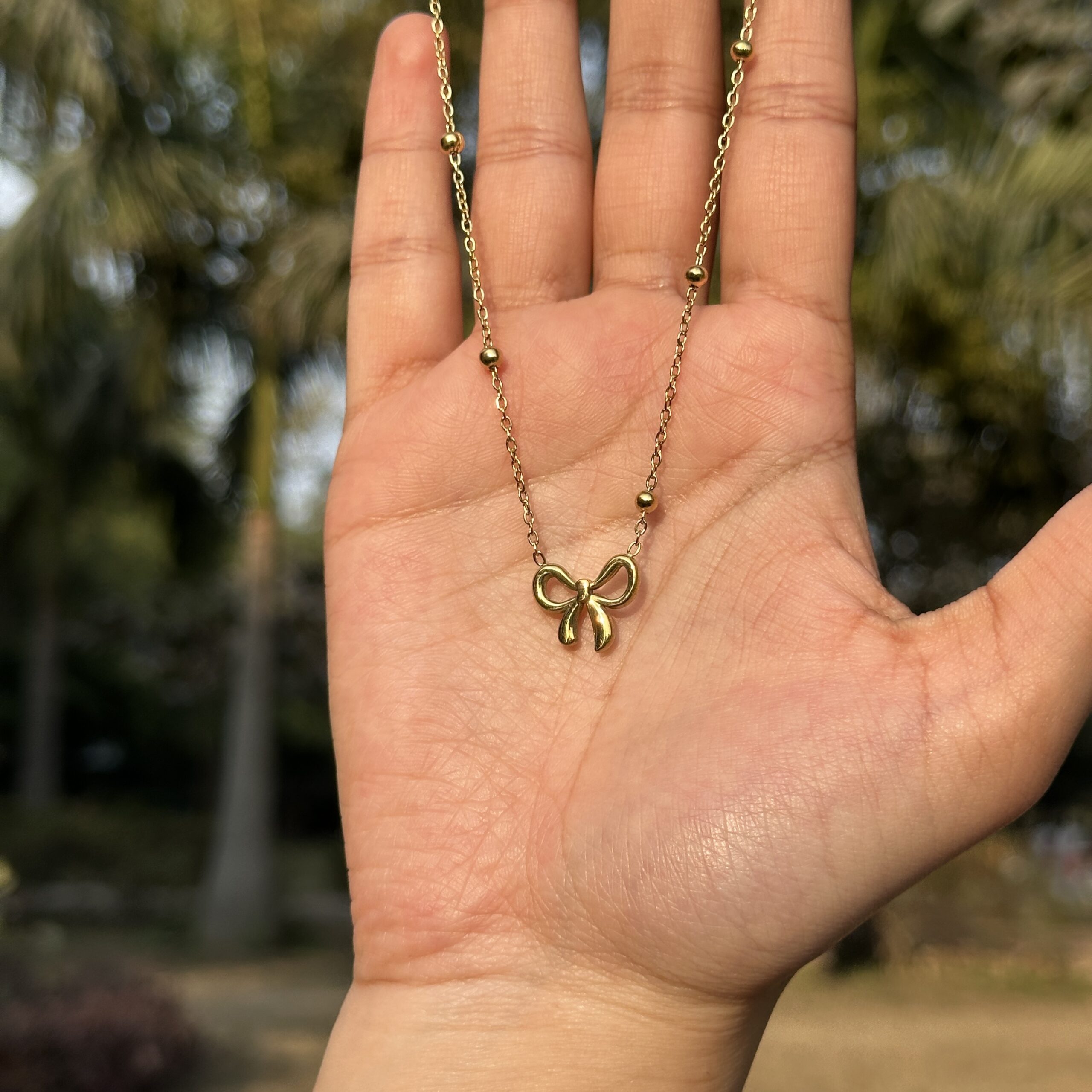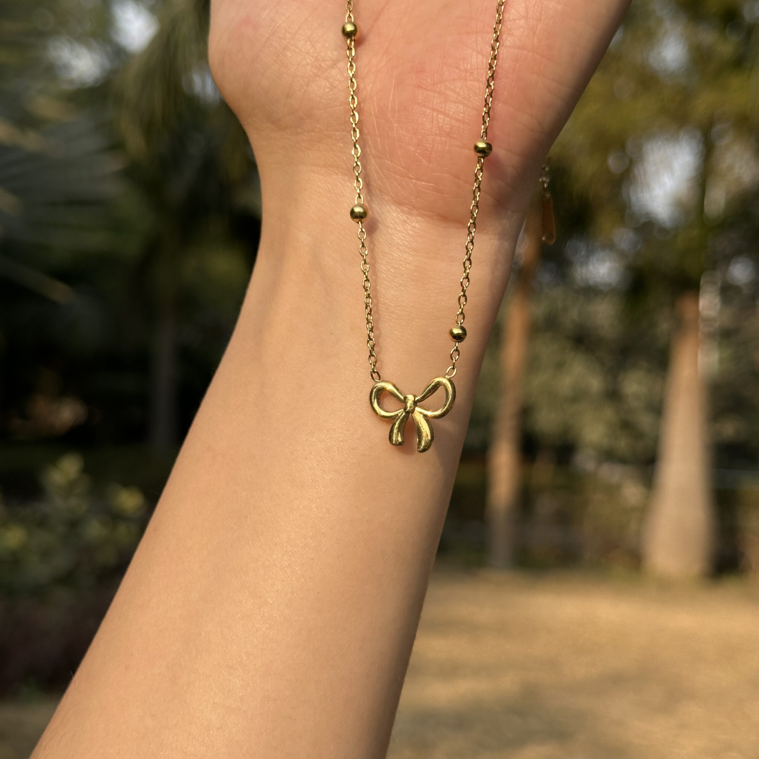 A delicate gold-tone chain accented with tiny beads and finished with a smooth bow-shaped charm. Lightweight and elegant, this necklace adds a soft, feminine touch to everyday and dressy looks.