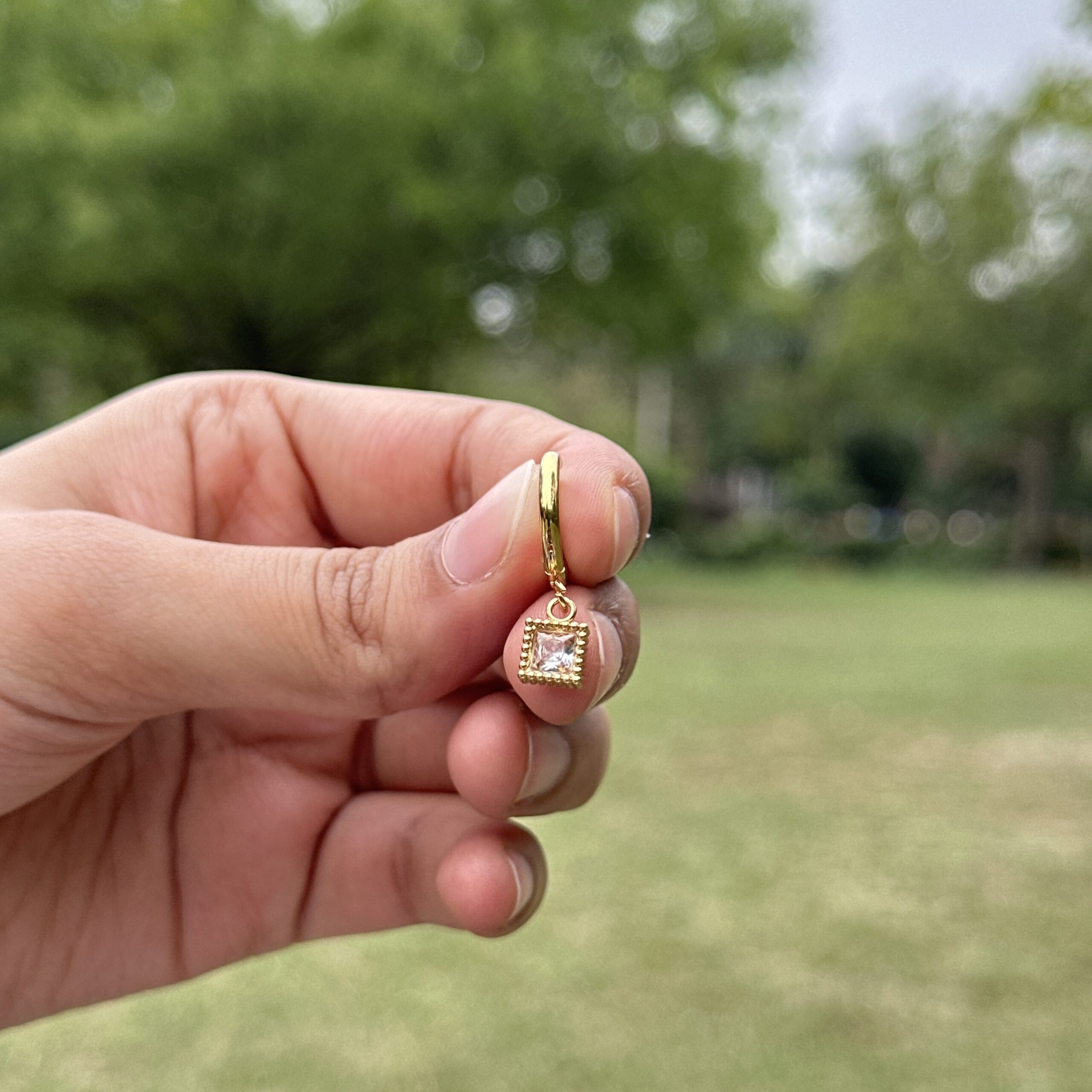 A pair of minimal hoops finished with a small square crystal drop that adds just the right amount of detail. The design is clean and balanced, making it easy to wear every day while still feeling a little dressed up. The subtle movement of the drop gives it a soft, elegant touch without being too much. Crafted with a stainless steel base and finished with an anti-tarnish coating, they’re made for regular wear while maintaining their shine. Style them with both casual and slightly dressy outfits when you want something simple but not too plain.