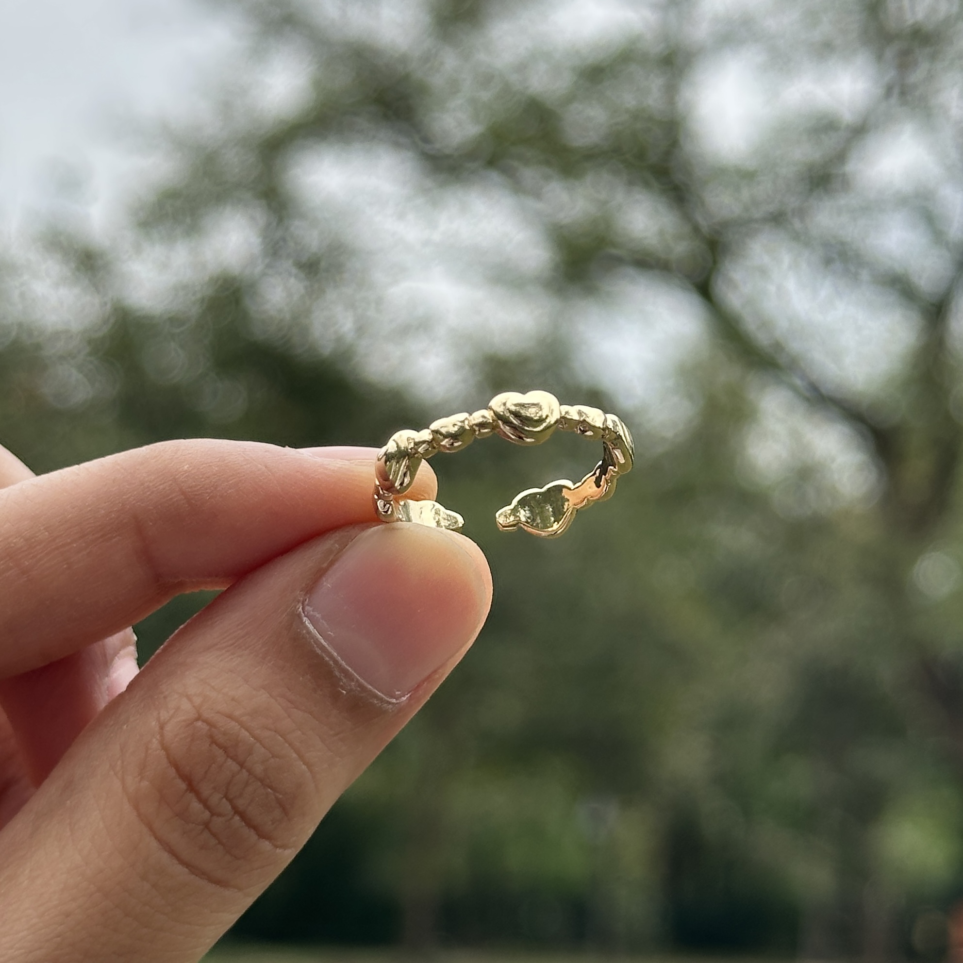 A slim band detailed with a continuous row of tiny hearts, giving it a soft and delicate look. It’s simple, easy to wear, and adds a subtle touch of charm without standing out too much. The repeated heart design makes it feel a little playful while still staying minimal enough for everyday wear. Crafted with a stainless steel base and finished with an anti-tarnish coating, it’s made to keep its shine through regular use. Style it on its own for a clean, cute look or stack it with other rings for a more layered feel.