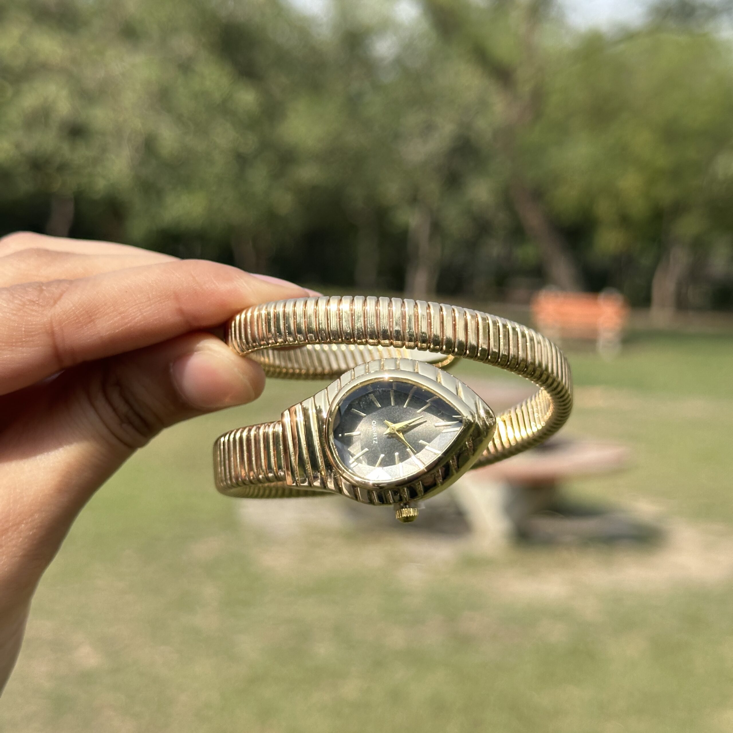 A sleek blend of structure and ease, this anti-tarnish watch features a flexible ribbed cuff design that wraps effortlessly around the wrist, paired with a bold black dial for a sharp, modern contrast. Designed for everyday wear, its anti-tarnish finish keeps the shine intact without constant upkeep, making it as practical as it is stylish. The sculpted band adds texture while maintaining a clean silhouette, giving it a refined, slightly vintage edge. It works especially well when styled solo as a statement piece or paired with minimal gold bracelets for a layered wrist that still feels effortless and uncluttered.