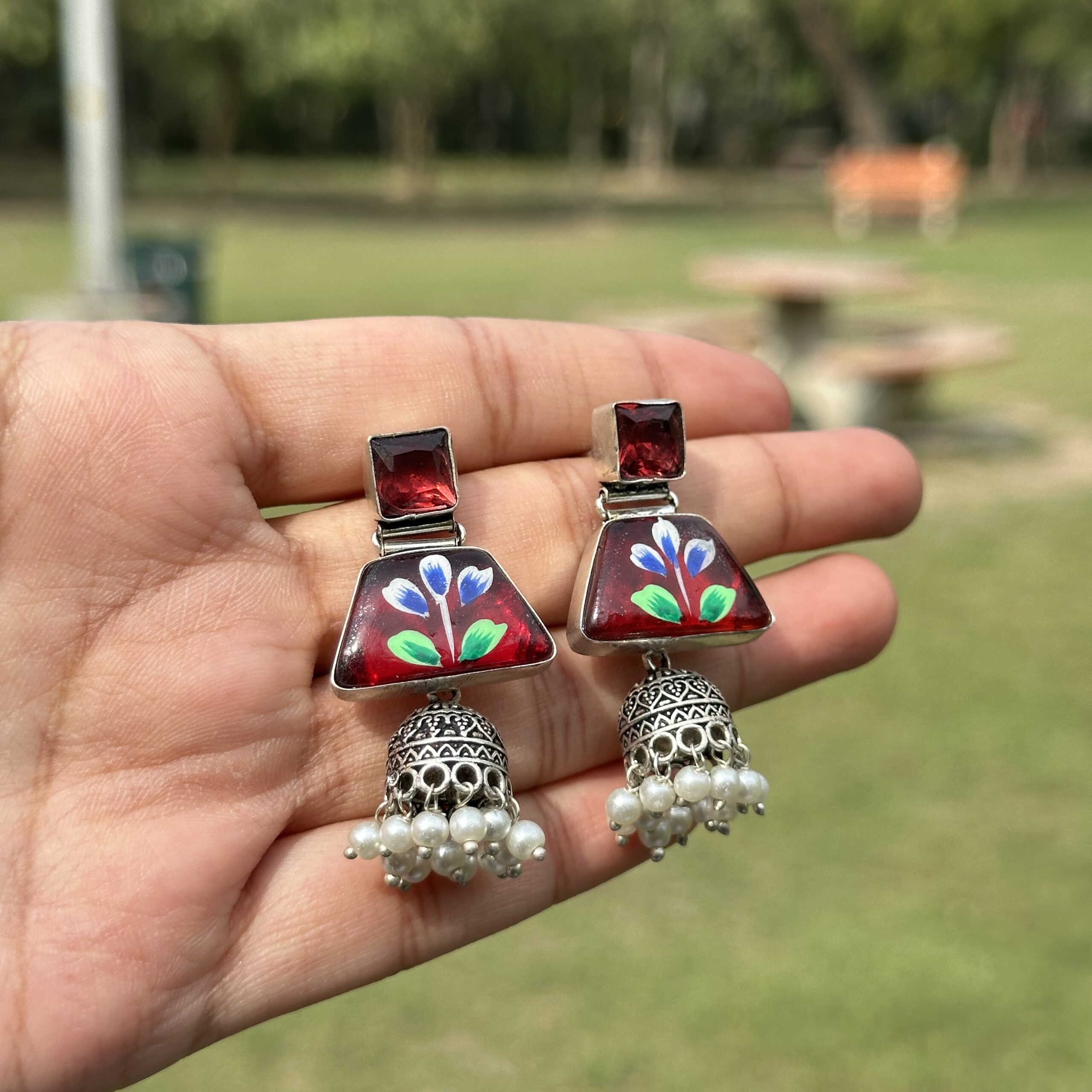 These enamel-painted jhumka earrings beautifully blend traditional form with artistic detailing, featuring a delicately crafted dome paired with vibrant hand-painted enamel accents. The rich colors and intricate patterns give them a lively yet graceful feel, making them stand out while still being easy to wear. The antique finish adds depth and character, enhancing the overall charm of the piece. Pair them with a cotton saree or a flowy kurta set to bring out their traditional vibe, or style them with a simple outfit to let the colors and detailing become the highlight effortlessly.
