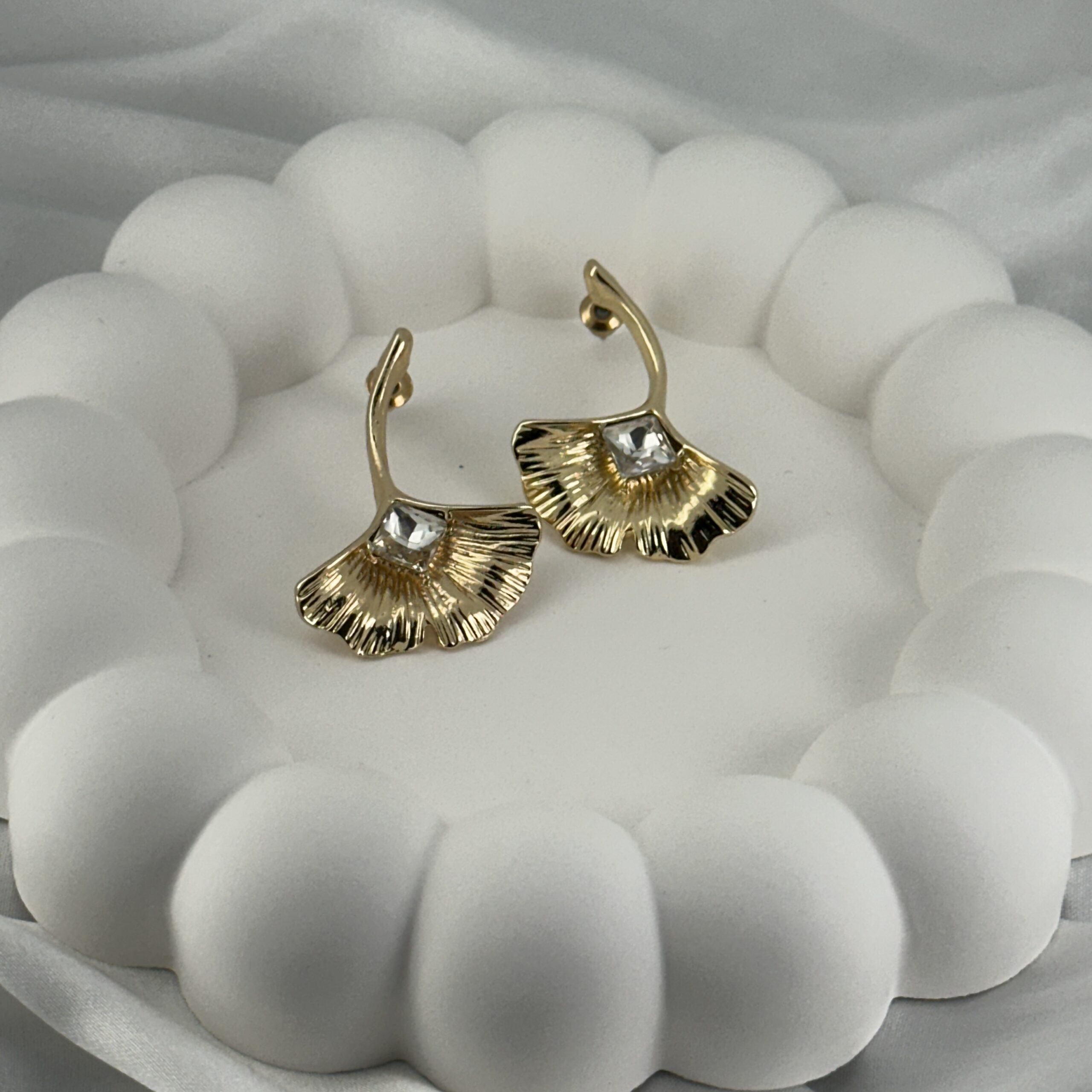 A sculptural little statement that reads both botanical and artful, the Gilded Ginkgo Studs are inspired by the fan-shaped ginkgo leaf, reimagined as a delicate, wearable ornament. Each earring features a finely textured, ruffled gold-tone leaf that catches light across its ridged surface, anchored at the center by a faceted cubic zirconia that adds a vintage flash without shouting. The slender, curved stem frames the lobe so the leaf appears to float just beneath the ear, giving the piece subtle movement and a wearable sculptural silhouette. It’s simultaneously refined and unexpected, an everyday heirloom that still feels modern.