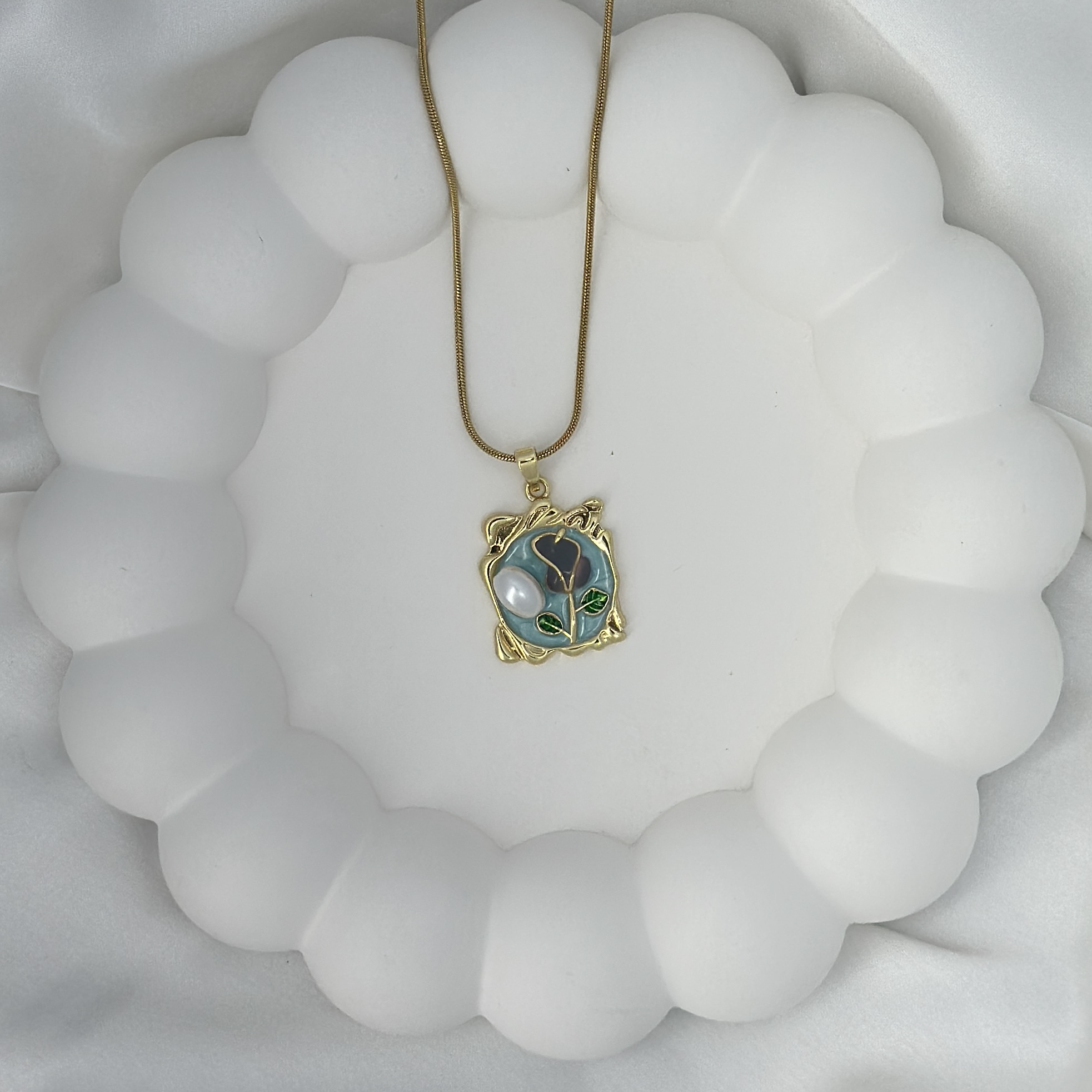 The Pearl Grove Necklace is a petite wearable tableau that evokes a serene moment in a garden. A marbled teal enamel field forms the pendant’s backdrop, its subtle surface texture and depth confirming this is hand-applied enamel. On top, glossy green enamel leaves and a petite dark accent frame a single baroque pearl that sits slightly raised, catching light with every turn. The pendant’s softly organic metal border lends the composition a framed, handcrafted feel, while maintaining a neat and modern overall silhouette. The piece hangs from a smooth snake-style chain that lies close to the throat; the compact scale keeps it low-profile and easy to wear from morning through evening. A discreet anti-tarnish finish helps preserve the metal’s polished look without calling attention to the treatment. Lightweight and tactile, the Pearl Grove Necklace feels personal, the kind of small, artful detail that brings a refined, whimsical note to everyday dressing.