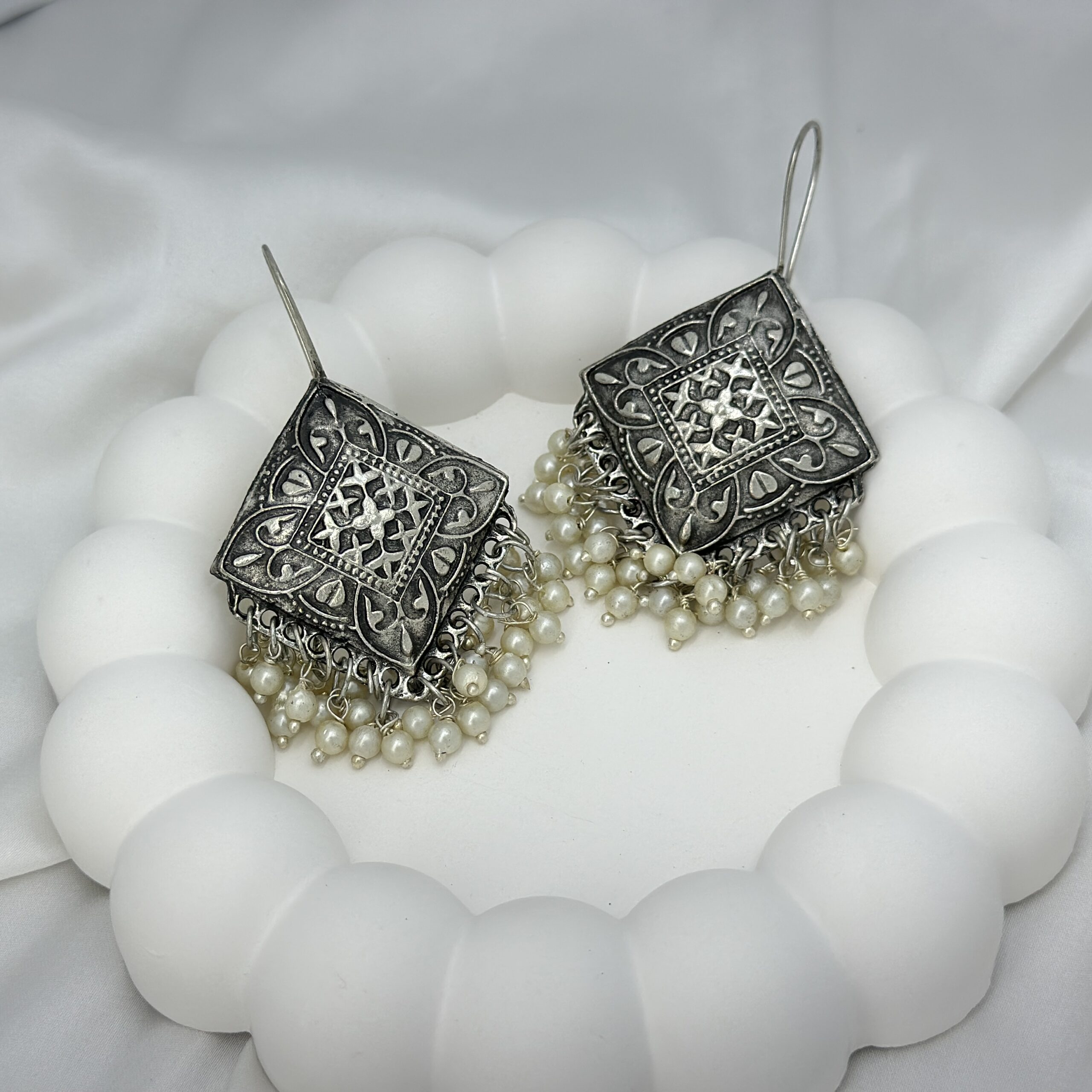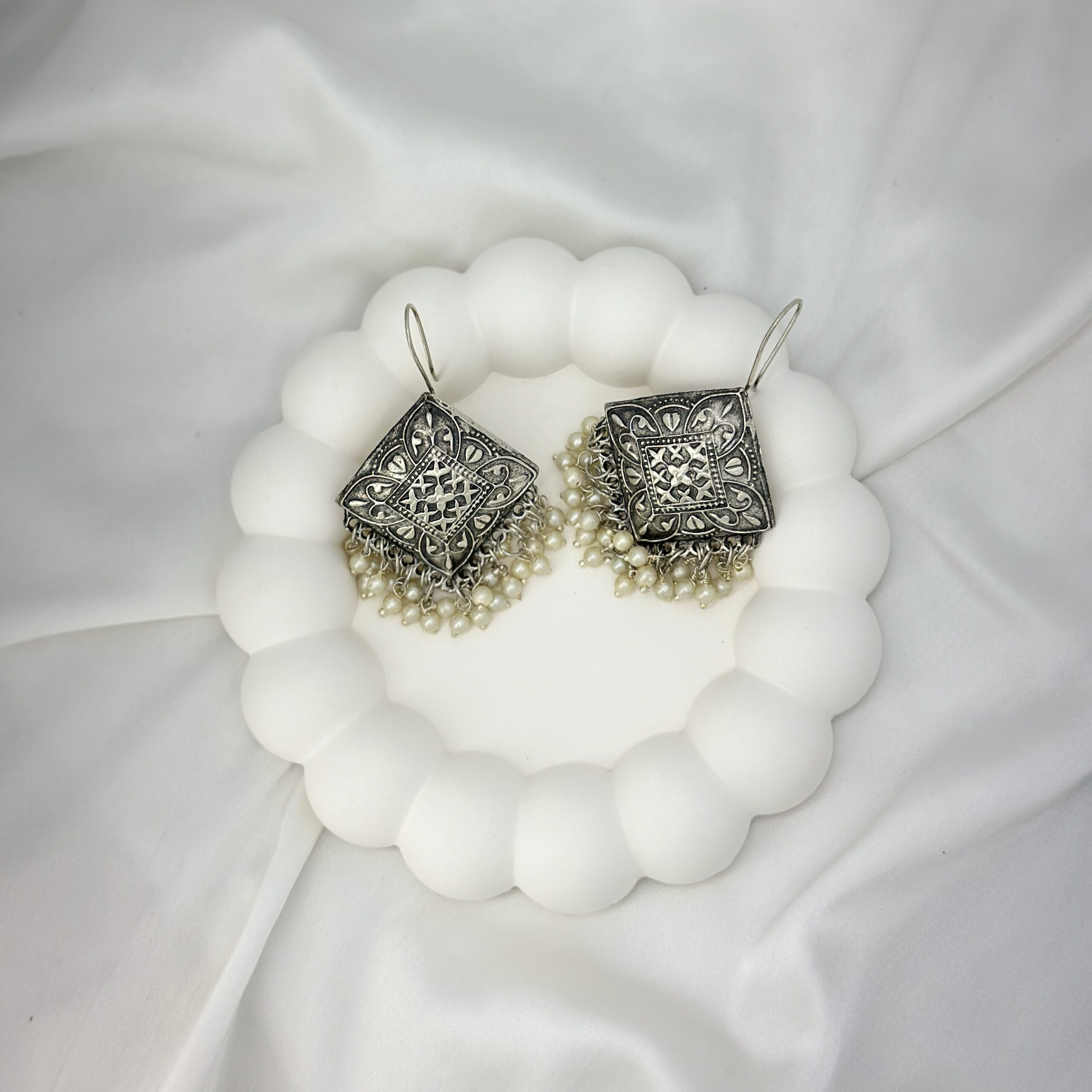 Heirloom Lattice Fringe Earrings translate age-old metalwork into a wearable statement. A carved, diamond-shaped panel reads like a tiny mandala, crisp jali lines and floral etching sit under a soft, oxidized patina that gives the surface a quietly antiqued depth. From the lower edge, a cluster of tiny ivory-toned pearl beads hangs in a lively fringe, catching movement and shadow with every turn of the head. The overall silhouette balances a close-to-lobe presence at the top with playful length below, so the design reads both architectural and feminine. Finished in an oxidized silver tone, these earrings feel handmade and slightly timeworn, perfect for someone who prefers jewelry with texture, history, and a crafted, artisanal voice.
