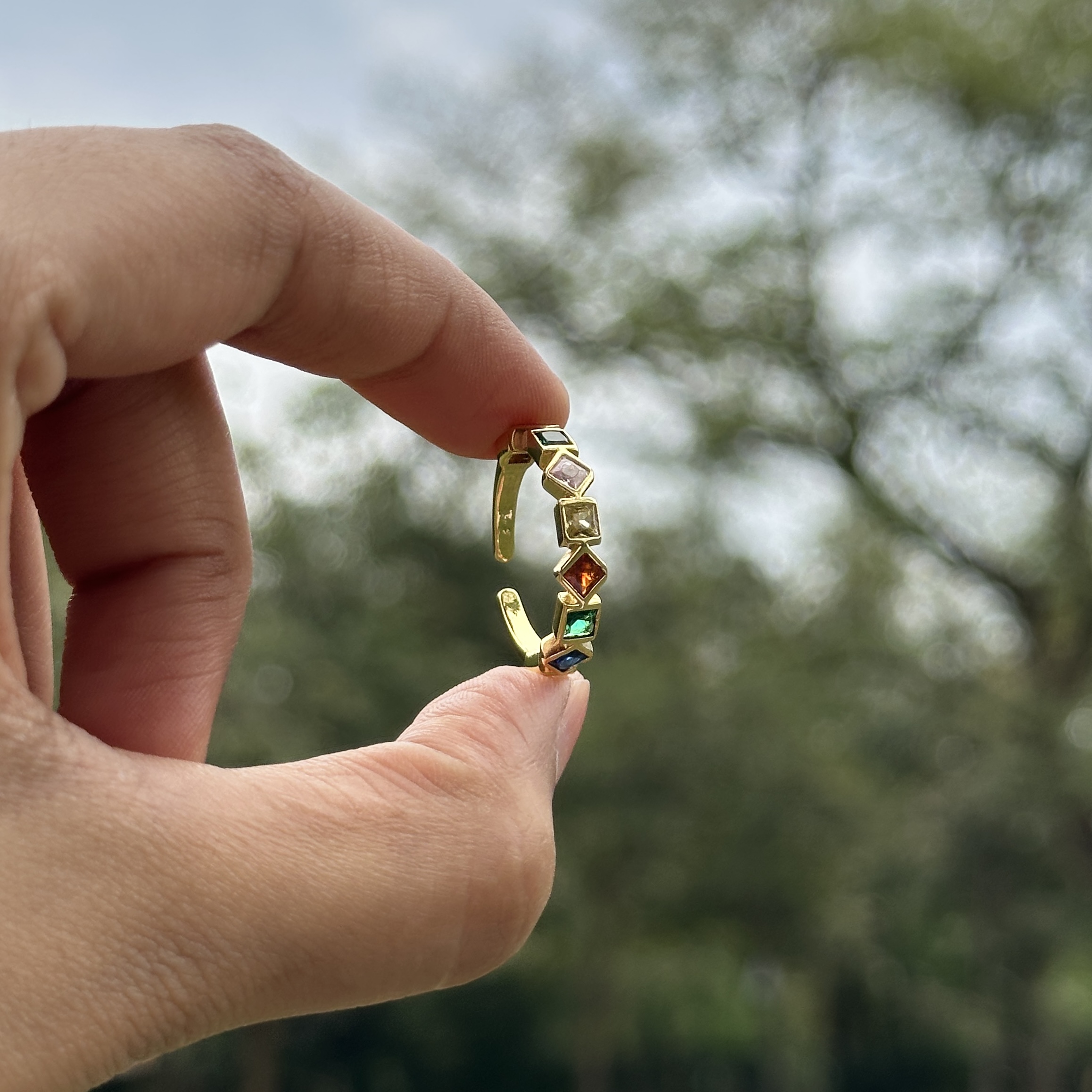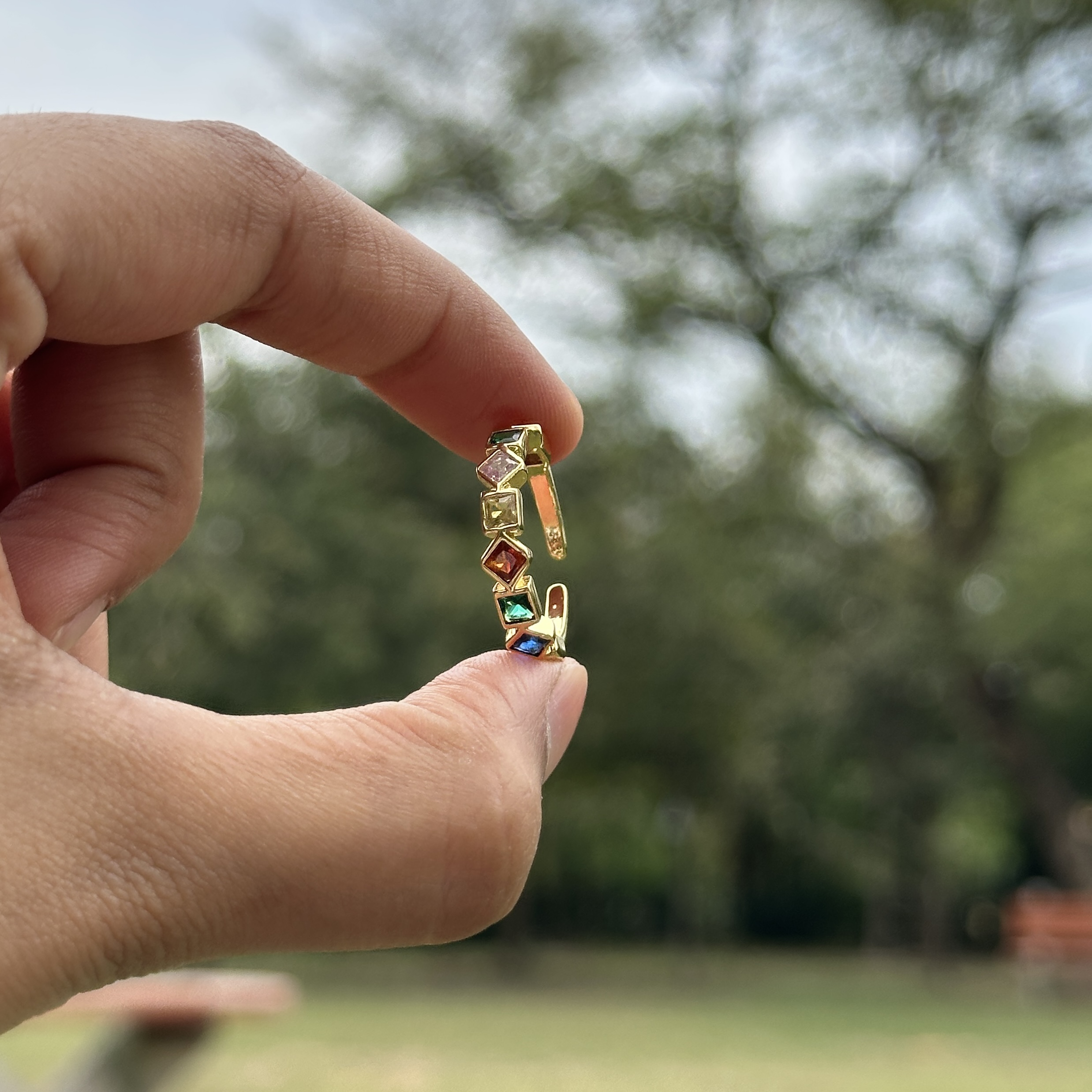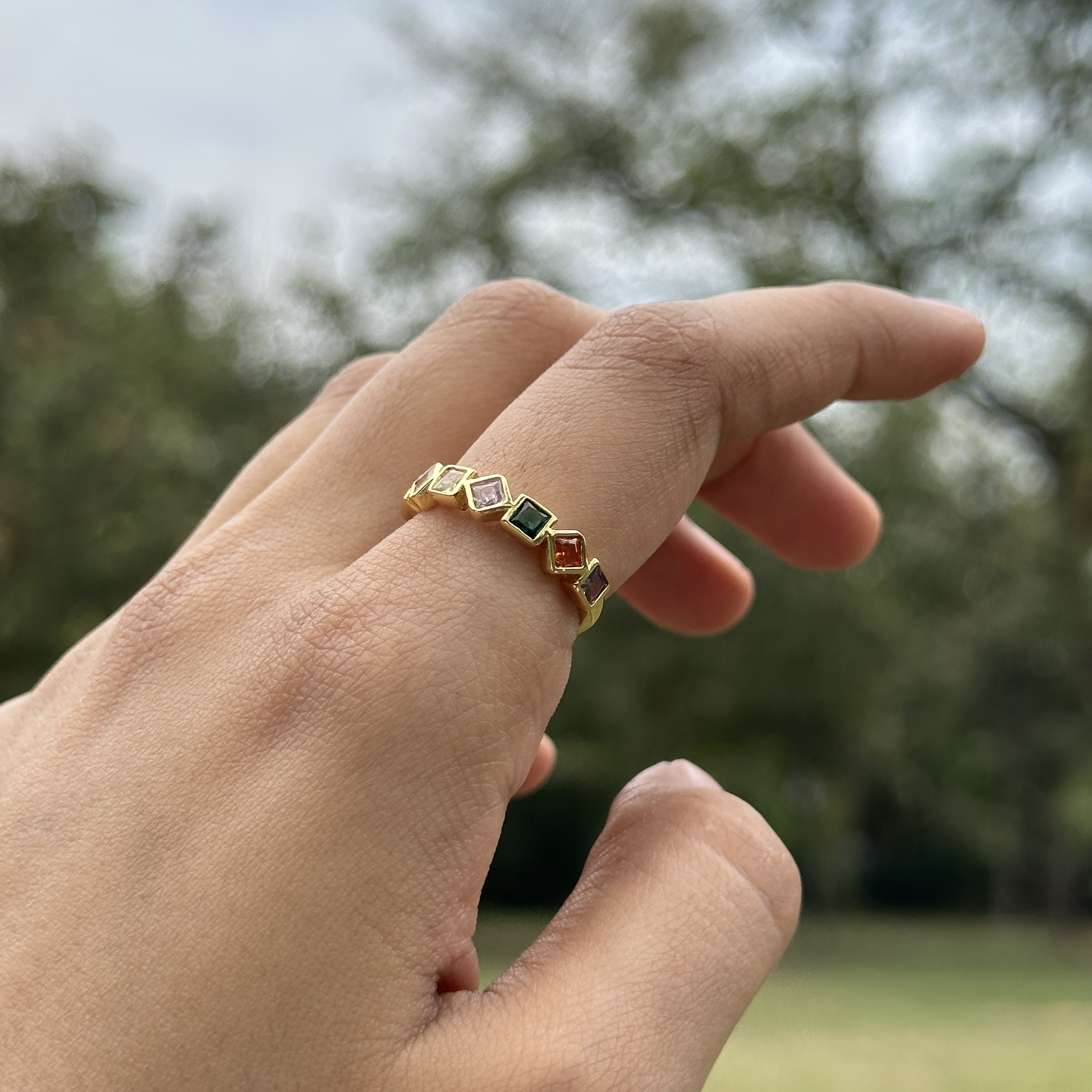 A playful ring designed with a row of small, colorful stones set side by side, creating a neat, tiled look. The mix of colors adds a fun touch without being too loud, making it easy to wear while still feeling a little different. It has a clean structure, but the details keep it interesting up close. Crafted with a stainless steel base and finished with an anti-tarnish coating, it’s made for everyday wear while maintaining its shine. Style it on its own for a subtle pop of color or stack it with simple rings to keep the focus on the details.