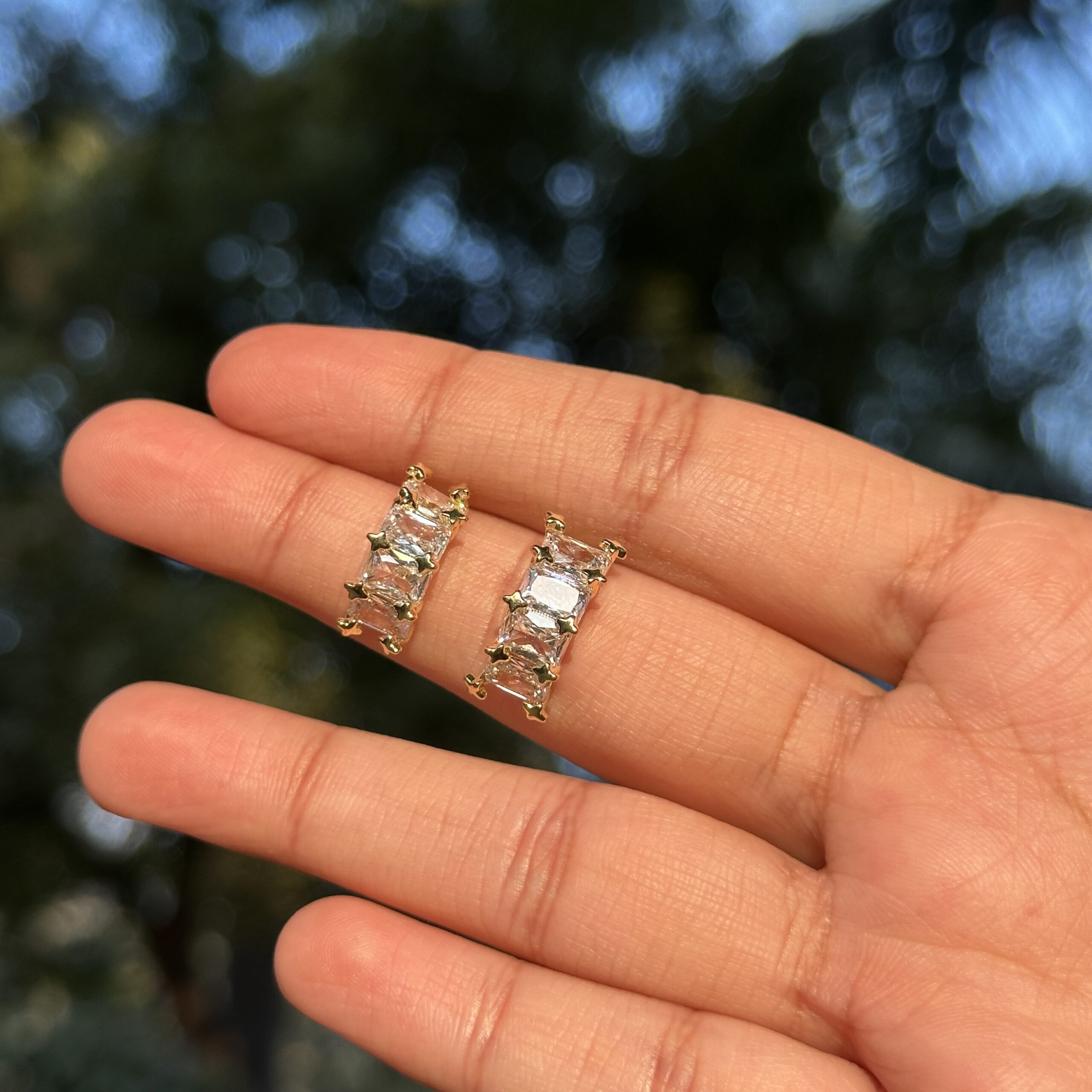 Sleek stud earrings featuring stacked baguette-cut stones set in a polished gold frame. Designed for refined everyday wear, these earrings add a sharp, luminous touch with a modern, structured finish.