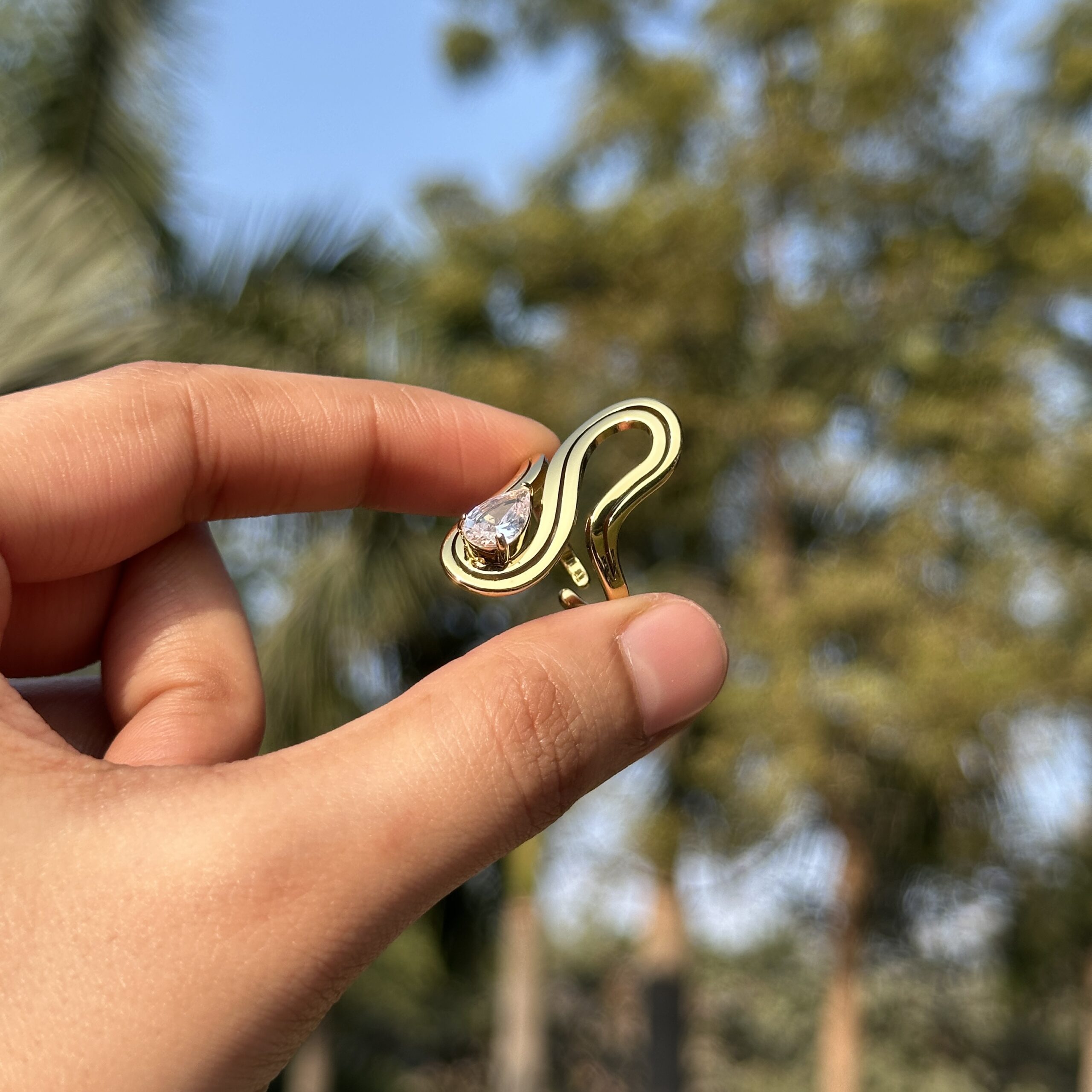 A bold sculptural adjustable ring designed with a graceful, flowing curve and a teardrop crystal centerpiece, creating a striking balance of modern elegance and artistic charm. A standout piece that elevates both everyday and occasion wear.