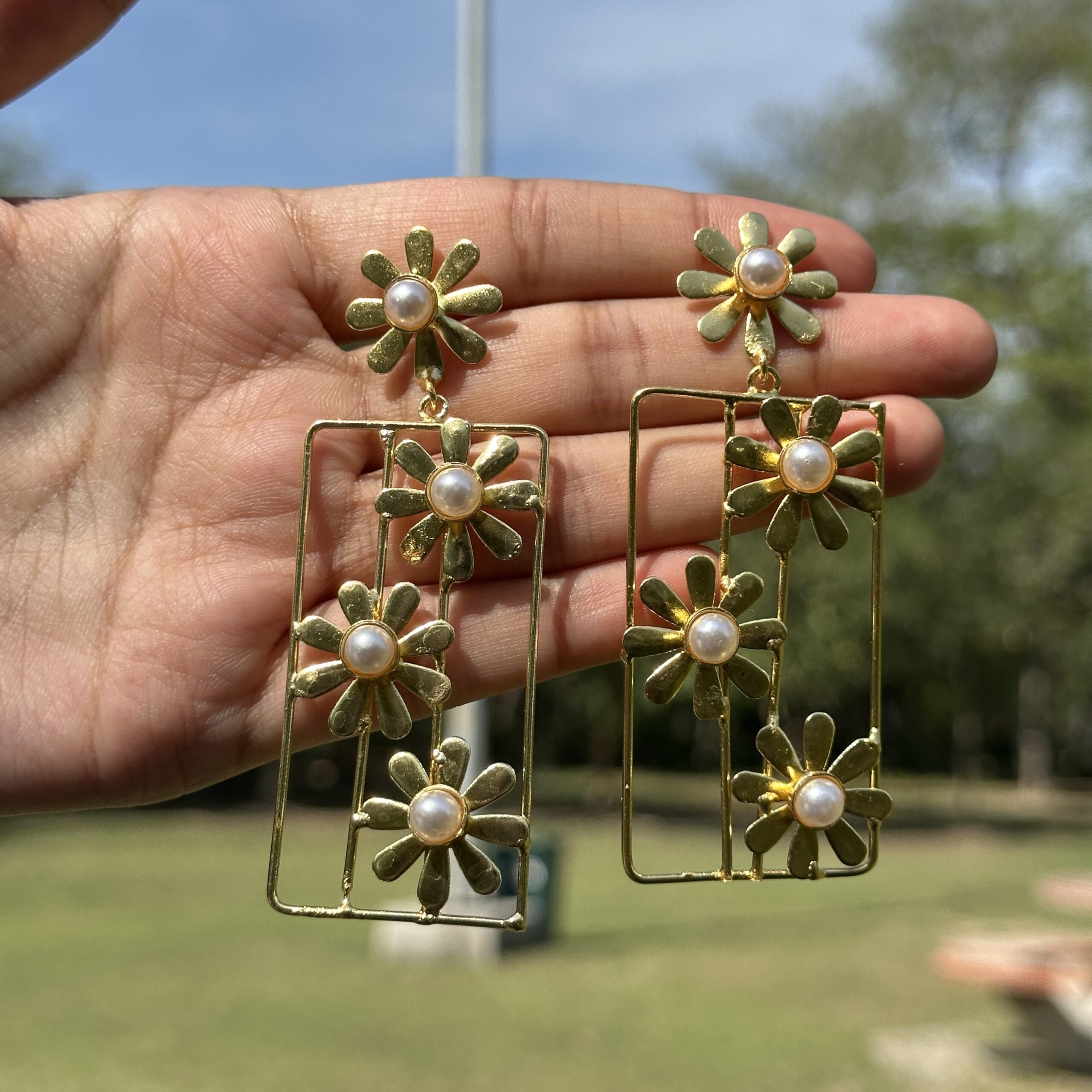 Delicate and full of charm, these Jaipuri earrings are crafted in a premium brass base with a rich gold-like finish that gives them a soft, radiant glow. Designed with dainty floral motifs placed within a minimal rectangular frame, each flower is centered with a subtle pearl-like accent that adds a hint of elegance. The lightweight brass structure makes them easy to wear, while the clean frame keeps the look modern despite its traditional inspiration. Though more refined in appearance, the artisanal Jaipuri craftsmanship still shines through in the detailing and finish. These earrings are perfect for adding a fresh, feminine touch to your look, style them with pastel outfits, summer dresses, or even a simple kurta to let the floral design bring a light, graceful vibe to your overall outfit.