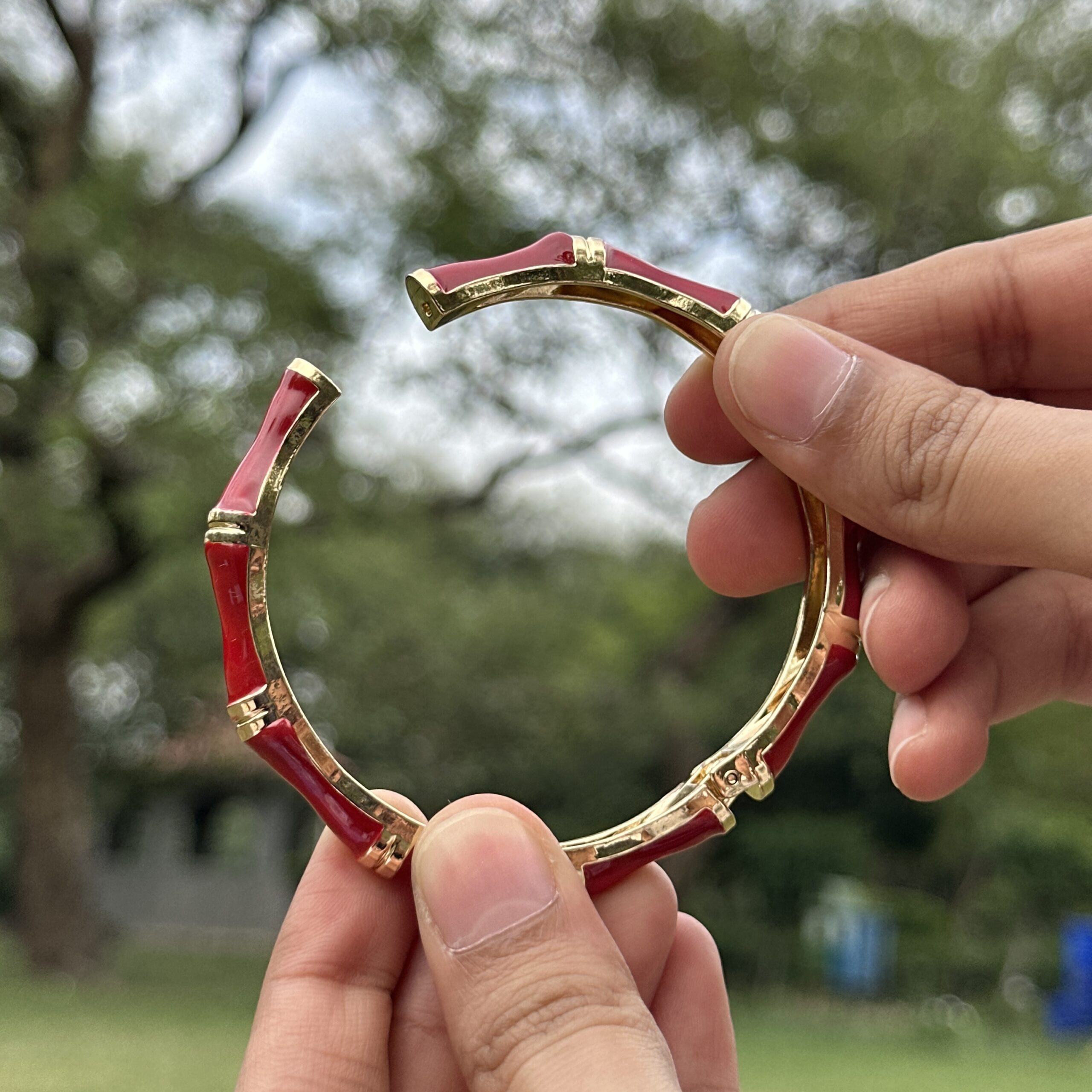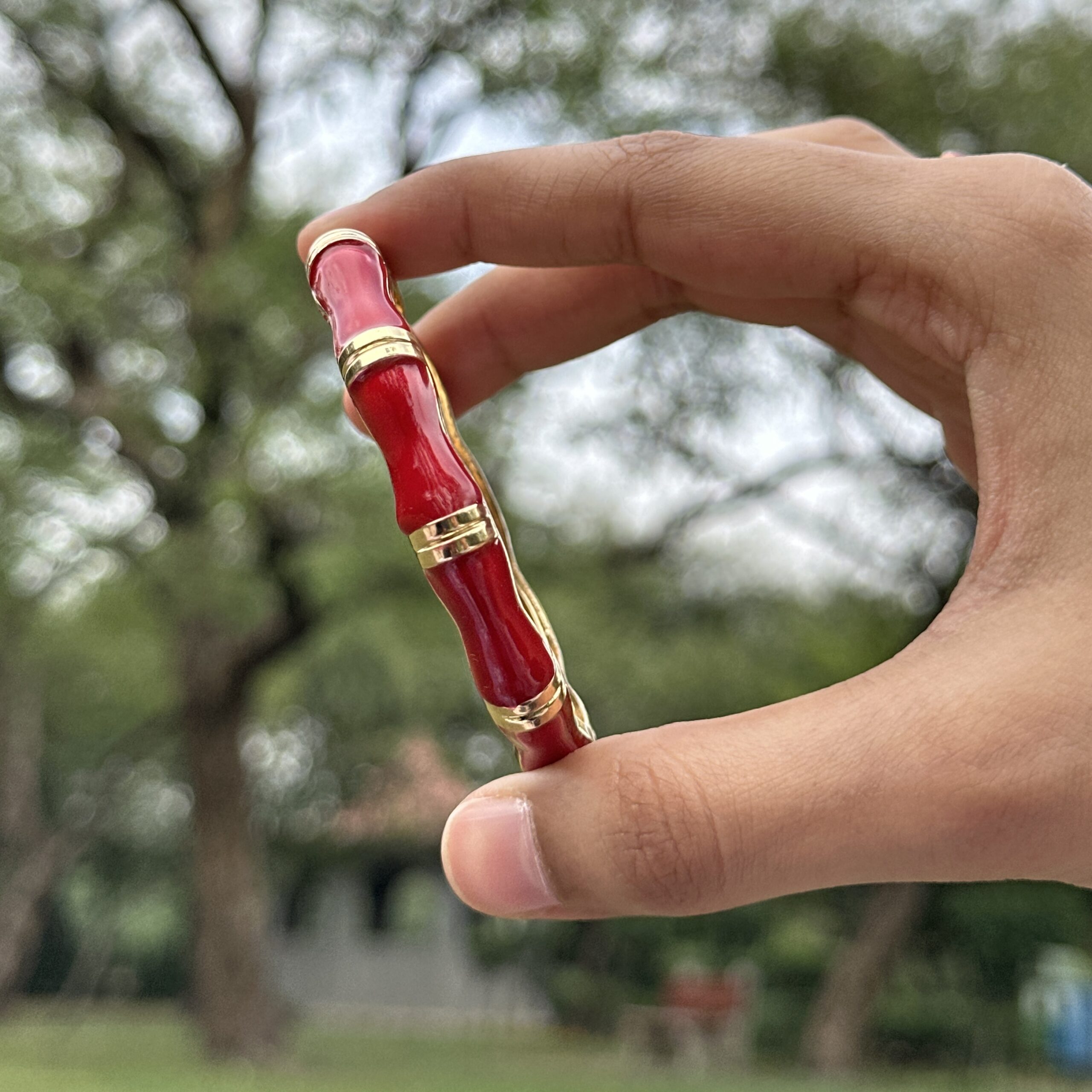 A bold anti-tarnish bracelet crafted in stainless steel and finished with rich red enamel detailing across a segmented, bamboo-inspired structure. The structured design gives it a strong, statement feel while still maintaining a sleek and polished look. Designed with an easy openable mechanism, it offers both comfort and convenience for everyday wear. The glossy enamel adds a vibrant pop of color, making it perfect for elevating even the simplest outfits. Style it solo to let the color stand out or pair it with minimal gold pieces for a clean, balanced look.