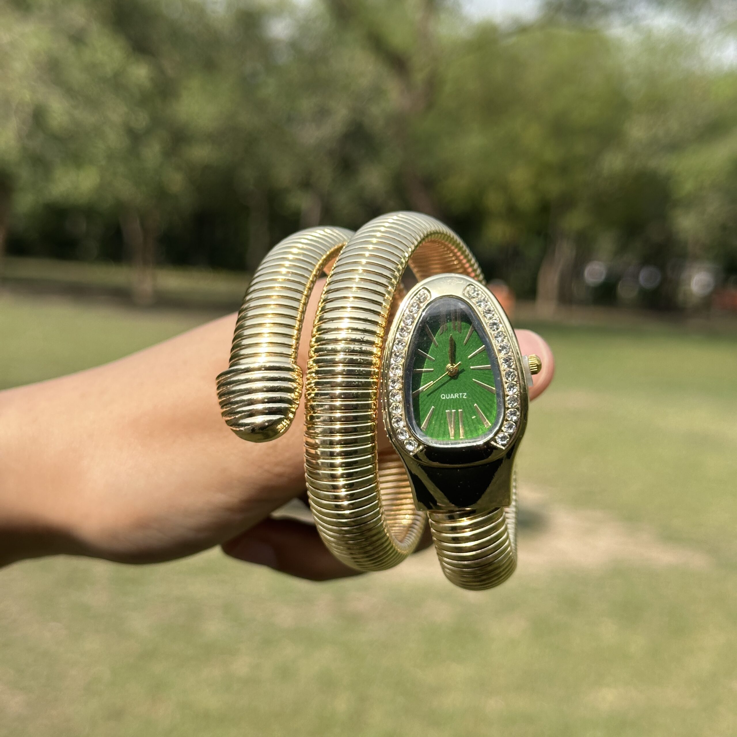 A bold anti-tarnish wrap watch designed with a coiled, bracelet-style strap that elegantly wraps around the wrist for a statement look. The structured gold-toned spiral creates a sculptural feel, while the sleek dial framed with subtle crystal detailing adds just the right touch of shine. Designed to stand out without compromising on everyday wearability, this piece blends fashion and function effortlessly. Style it solo as a statement accessory or pair it with minimal outfits to let the watch take center stage with its unique wrap design.
