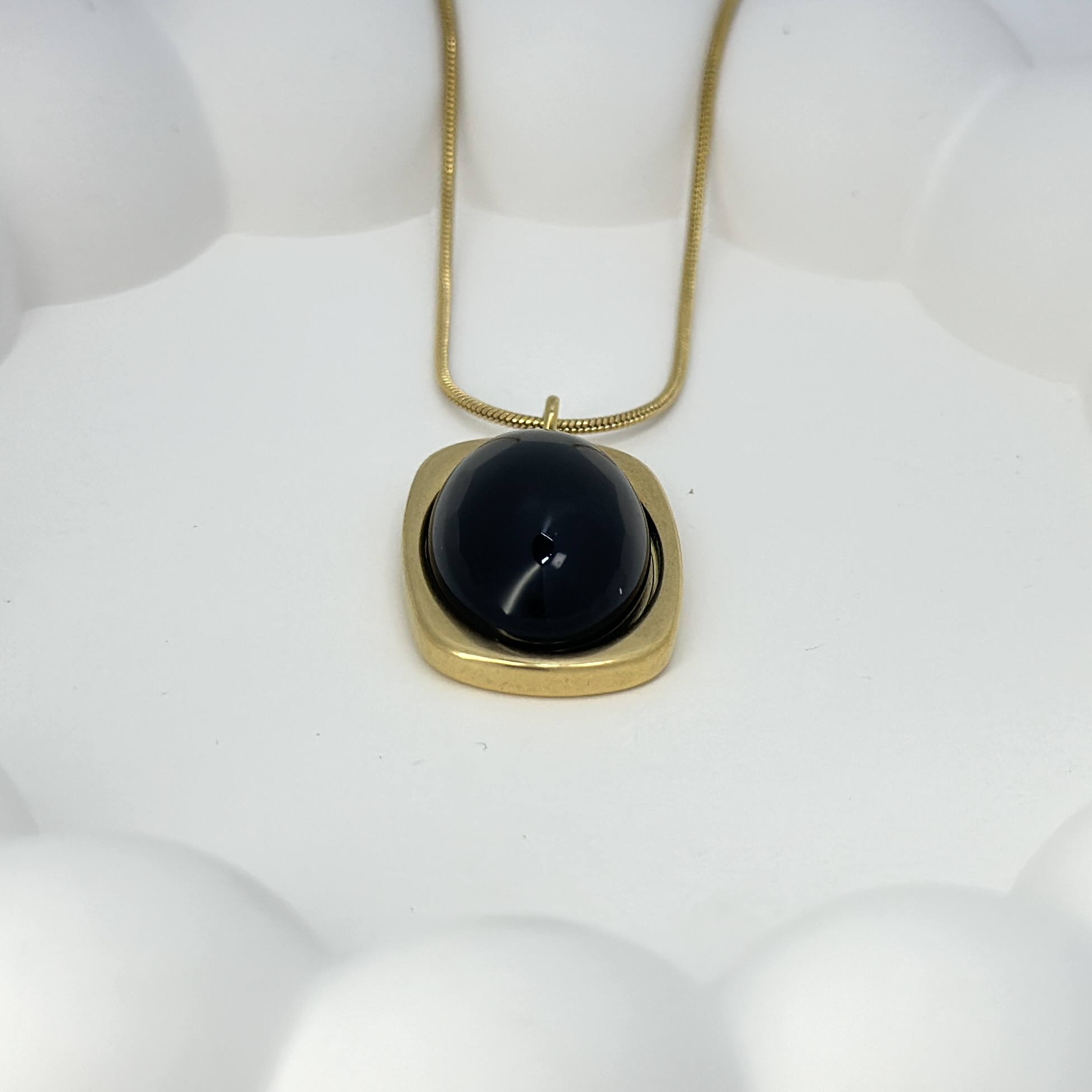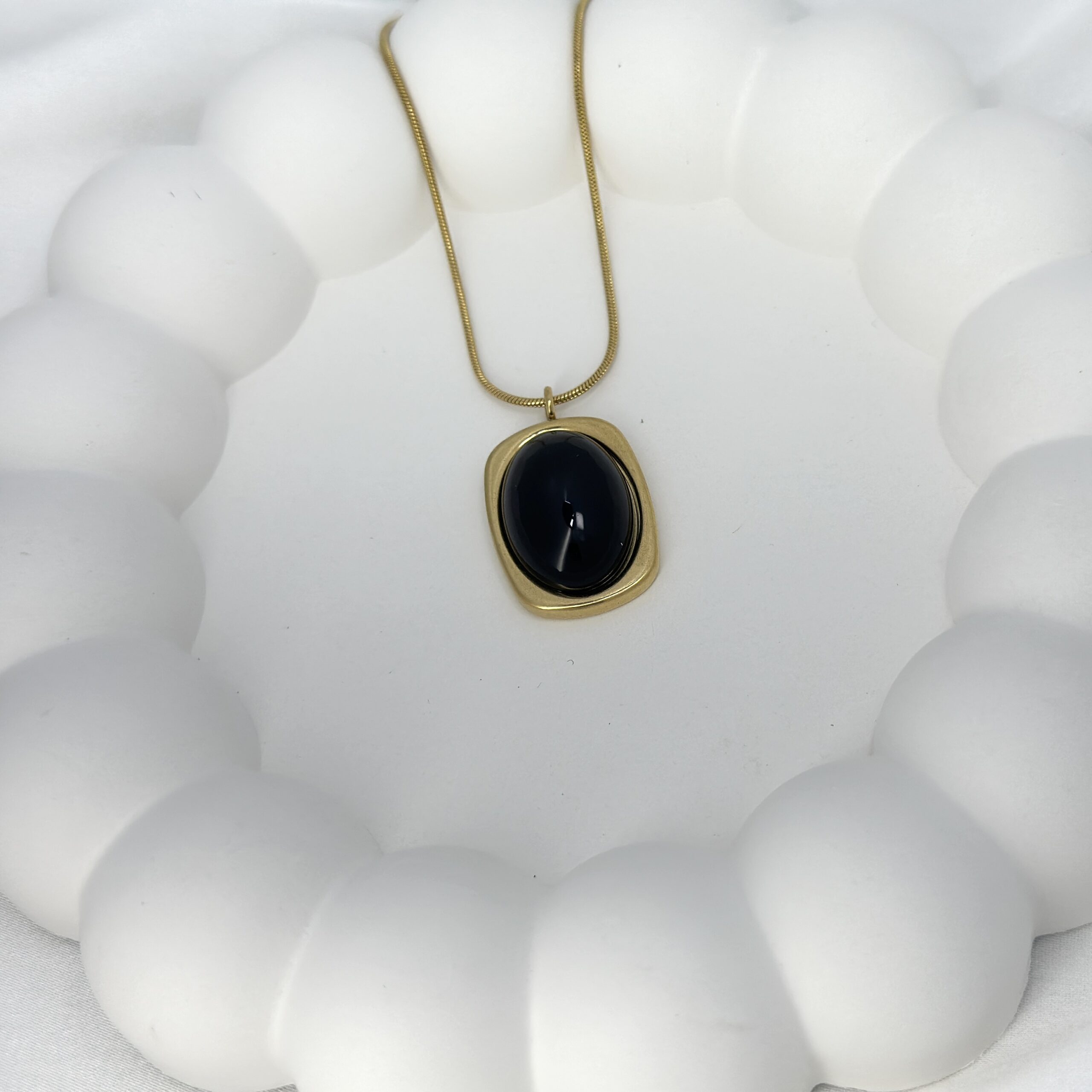 The Shadow Oval Necklace centers a deep, domed black cabochon that reads like a small black mirror, calm, reflective, and distinctly modern. The stone-like inlay is set in a gently rounded cushion bezel whose soft corners and polished planes give the pendant an architectural, tactile presence without feeling heavy. Suspended from a sleek snake-style chain, the pendant sits close to the throat and moves with a quiet, assured poise. Its pared-back palette and sculptural silhouette make this a go-to piece when you want an accessory that anchors an outfit rather than competes with it. The design balances presence with restraint: the strong black center gives the necklace visual weight while the rounded metal frame and slim chain keep the overall look refined and wearable for everyday.
