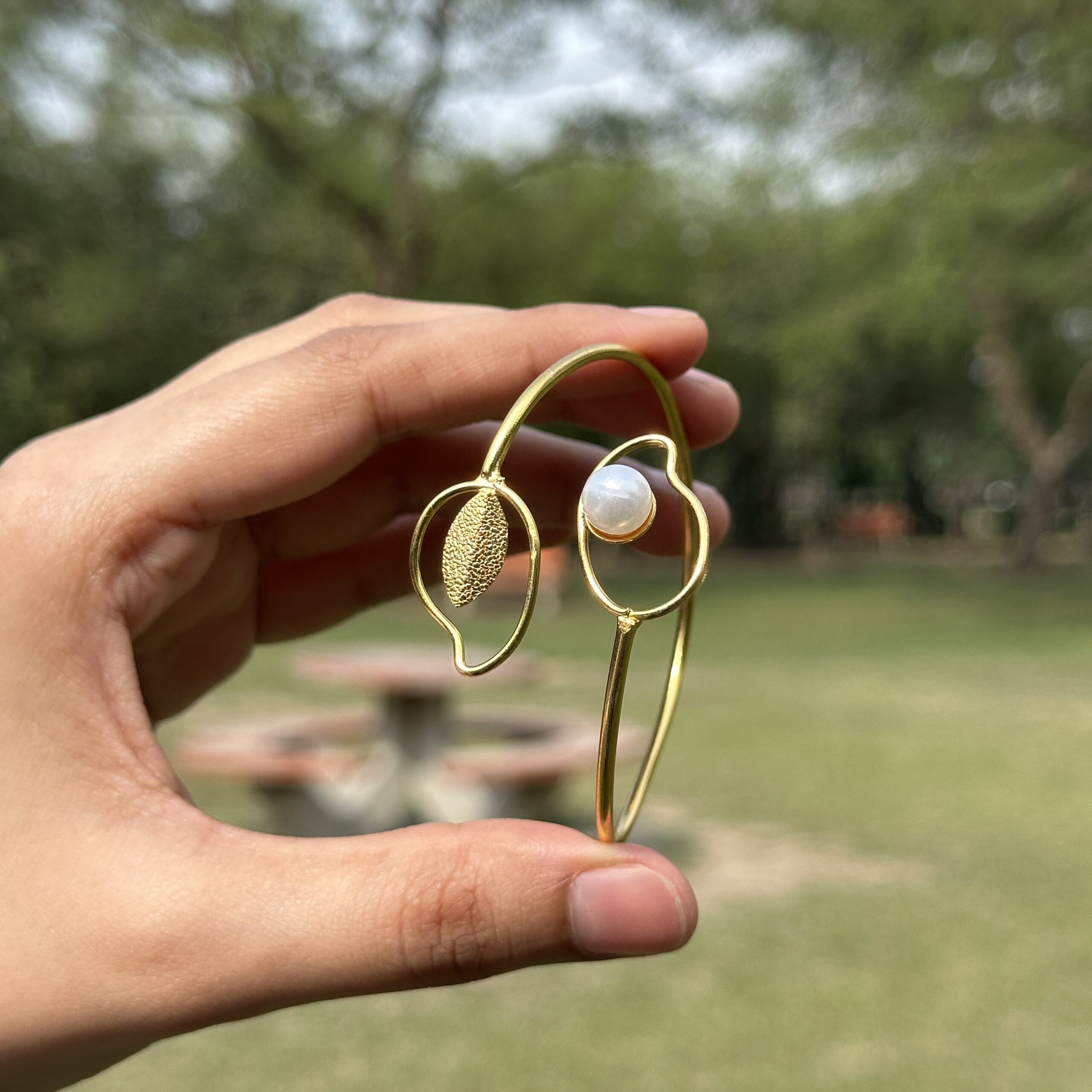 A minimal yet striking Jaipuri bracelet, designed with a smooth, flowing arc that wraps elegantly around the wrist. Crafted in a rich gold-tone brass base, this piece reflects Jaipur’s refined craftsmanship through its clean form and subtle handcrafted finish. Its surface carries a soft, uncut-inspired texture, adding depth while keeping the look modern and understated. Made using semi-precious elements, this bracelet blends tradition with simplicity, making it an effortless addition to both everyday and occasion wear. The open design makes it adjustable, ensuring a comfortable fit, and it can also be styled as an arm cuff for a more elevated, statement look. Wear it solo for a clean, polished feel or pair it with structured outfits and let it sit slightly higher on the arm to highlight its sculptural shape in a more contemporary way.