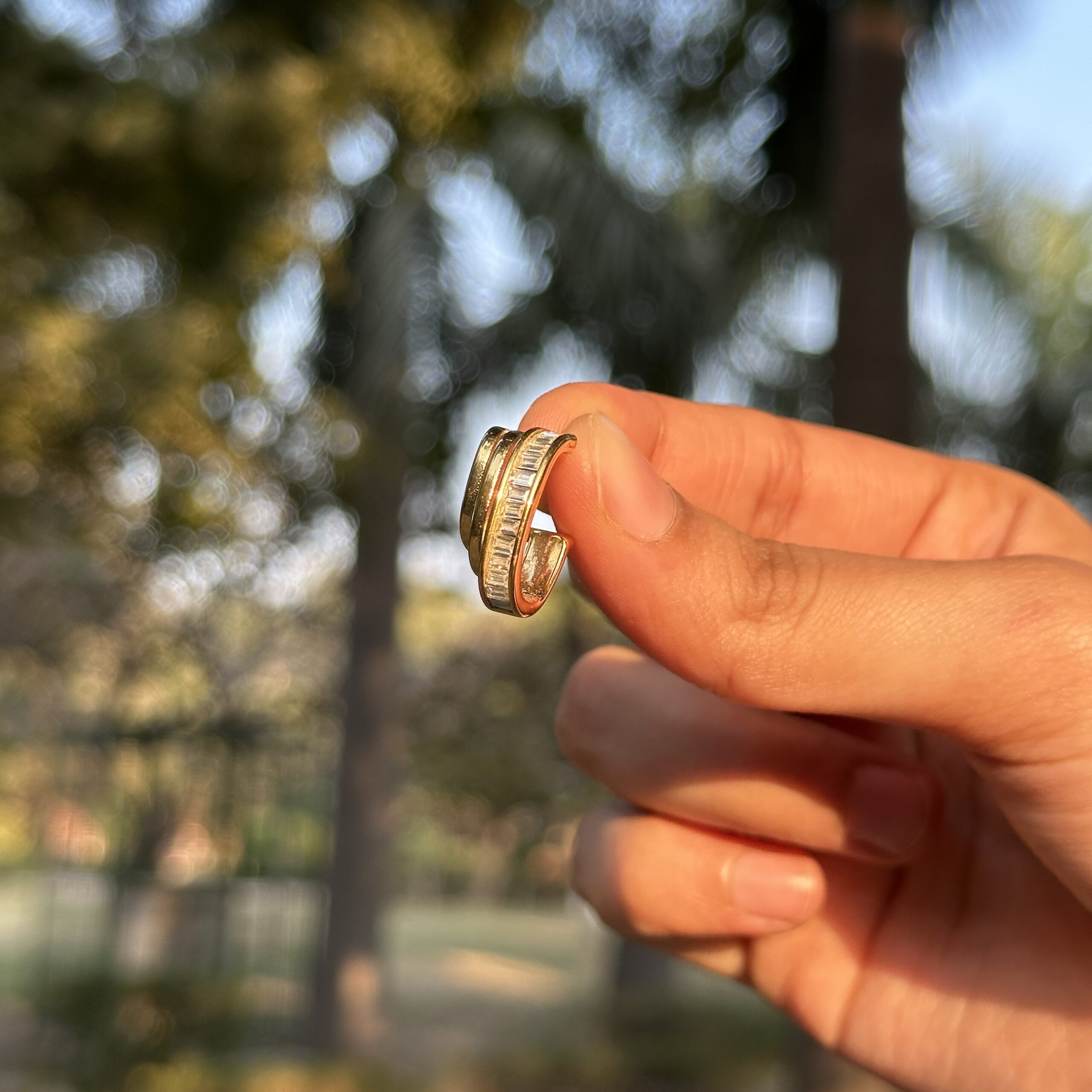 A refined pair of gold huggie hoops with layered bands and subtle baguette sparkle, designed for effortless everyday elegance.
