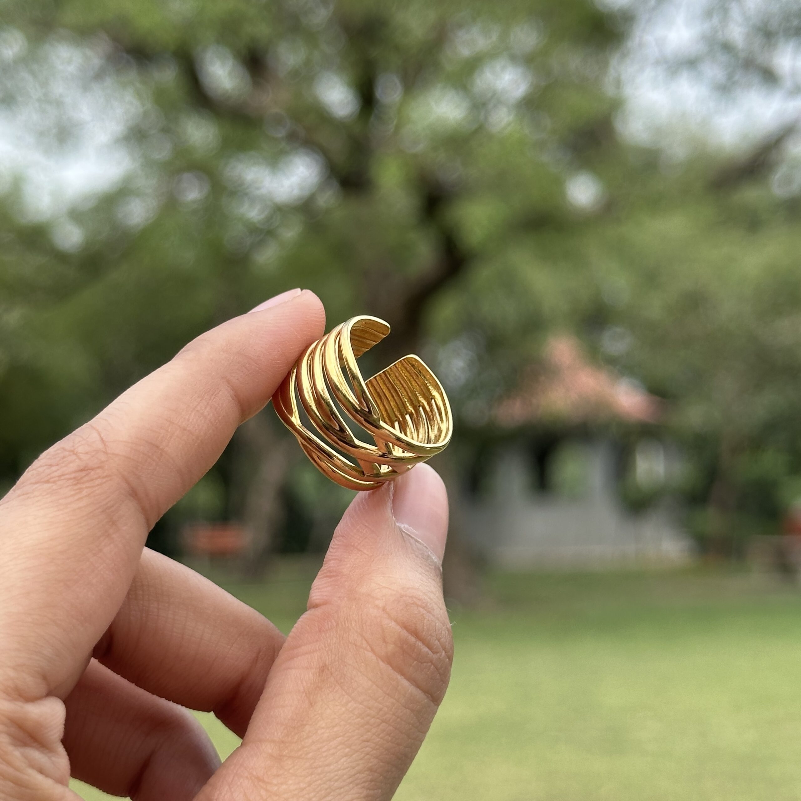 A beautifully crafted anti-tarnish layered band ring inspired by the organic beauty of intertwining branches, designed with multiple flowing lines that create a graceful woven effect around the finger. The polished gold-tone finish gives it a rich, elegant shine, while the anti-tarnish coating helps preserve its lustre for long-lasting everyday wear. Its slightly open and flexible structure offers a comfortable, adjustable fit, making it easy to wear across different sizes. The textured layered design adds depth and dimension, making it perfect as a statement ring on its own or paired with minimal bands for a stylish stacked look.