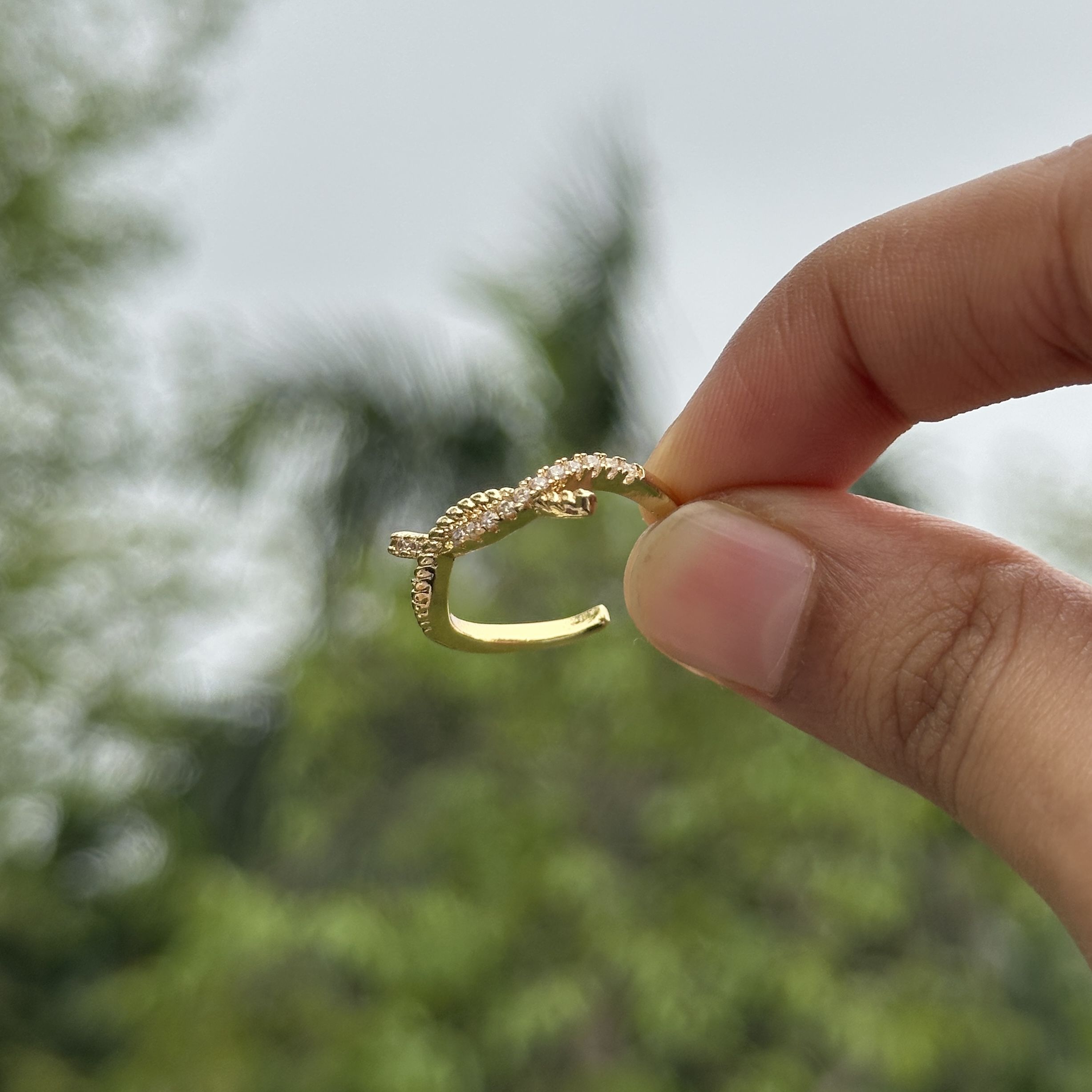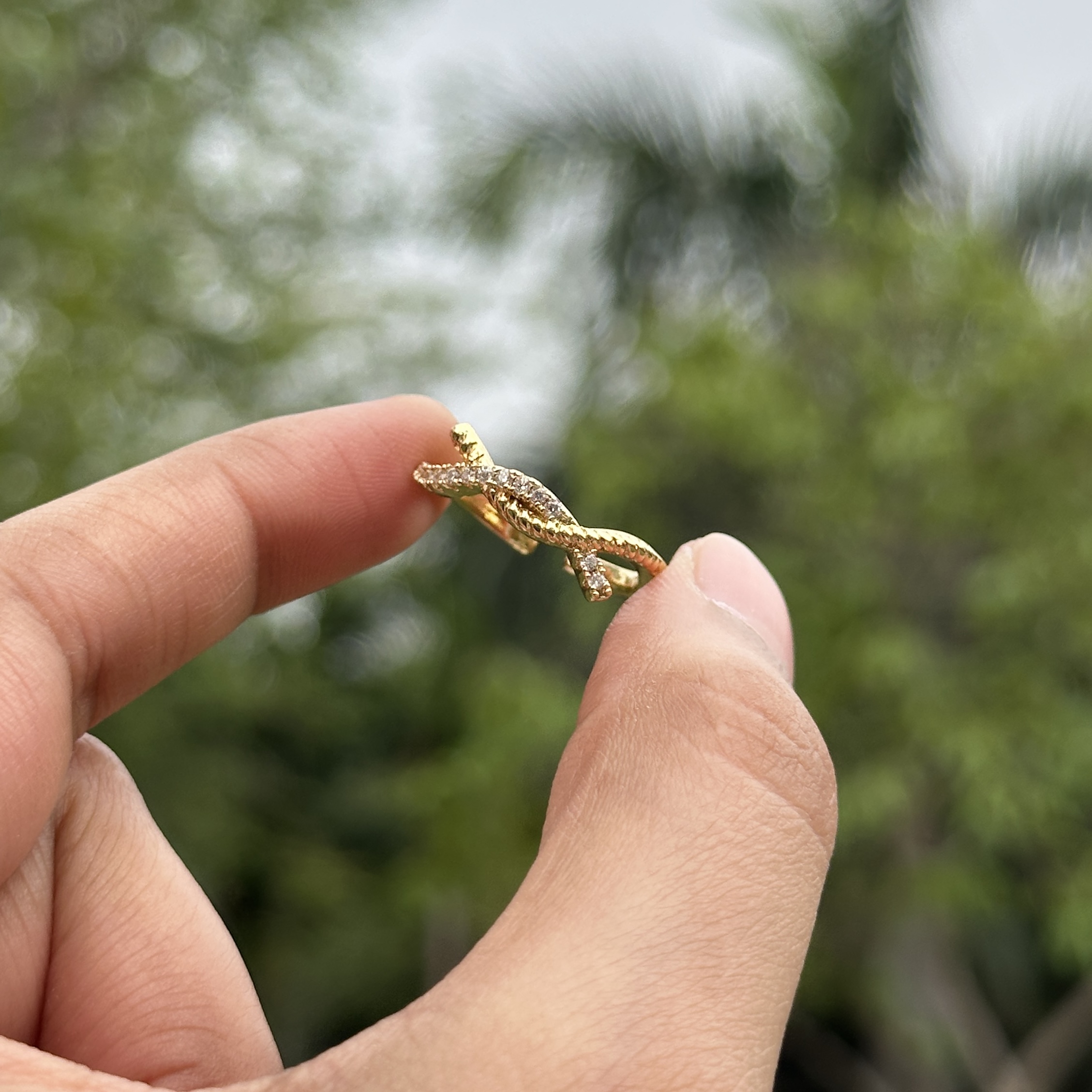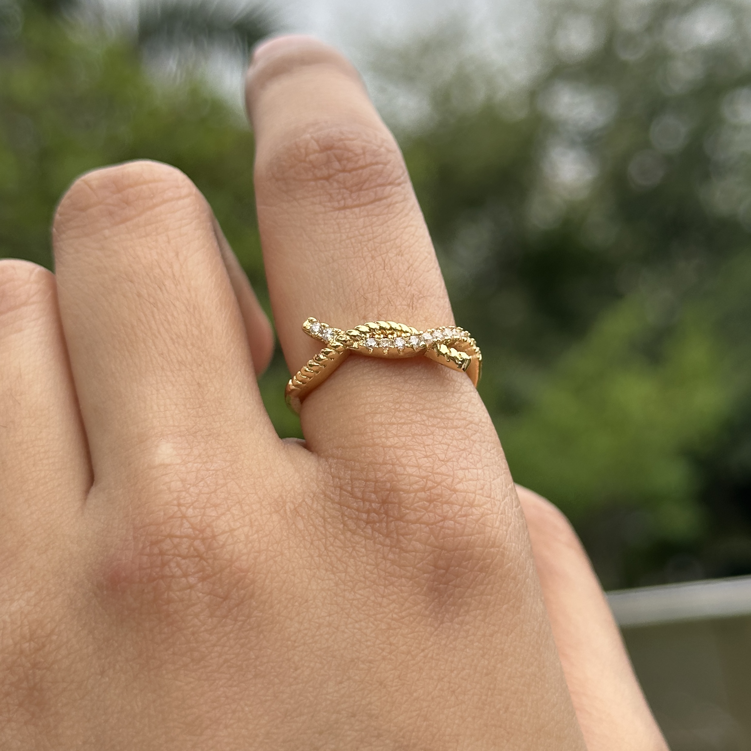 A beautifully crafted anti-tarnish adjustable ring featuring an elegant twisted knot design at the front, symbolizing connection, style, and timeless charm. The knot detail is delicately accented with tiny shimmering stones that add a subtle sparkle without overpowering the design. Its polished finish and refined silhouette make it perfect for both everyday wear and dressier looks. The adjustable fit ensures comfortable wear across sizes, while the anti-tarnish coating helps maintain its shine and keeps it looking fresh over time. Wear it on its own as a delicate statement piece or stack it with sleek bands for a chic layered look.