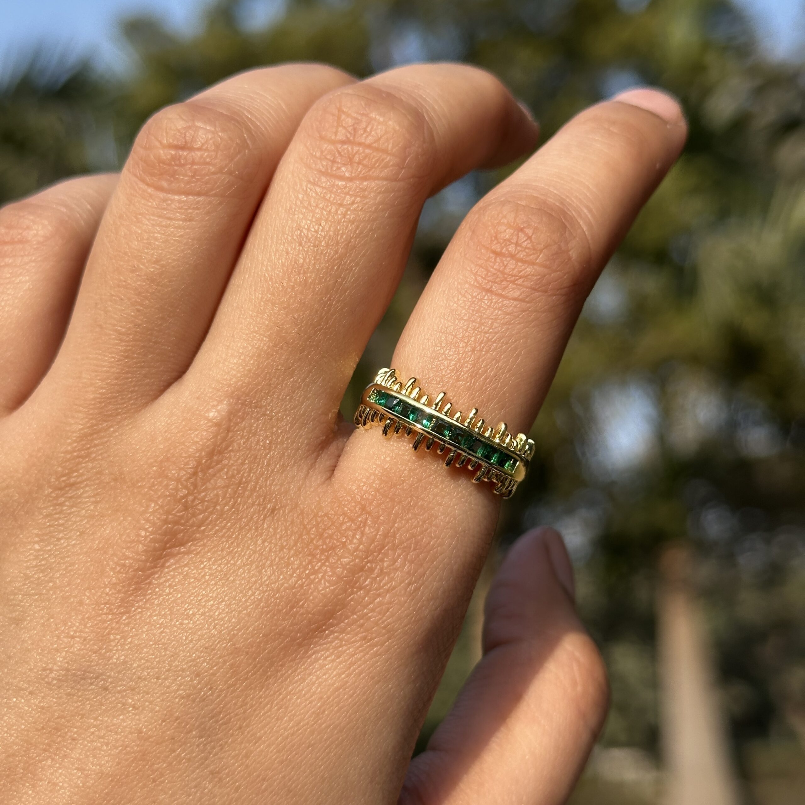 A gold-tone statement adjustable ring featuring a sleek row of emerald-green stones, framed with fine textured detailing for added brilliance. Designed to stand out with modern elegance and a rich pop of color, perfect for both everyday wear and special occasions.
