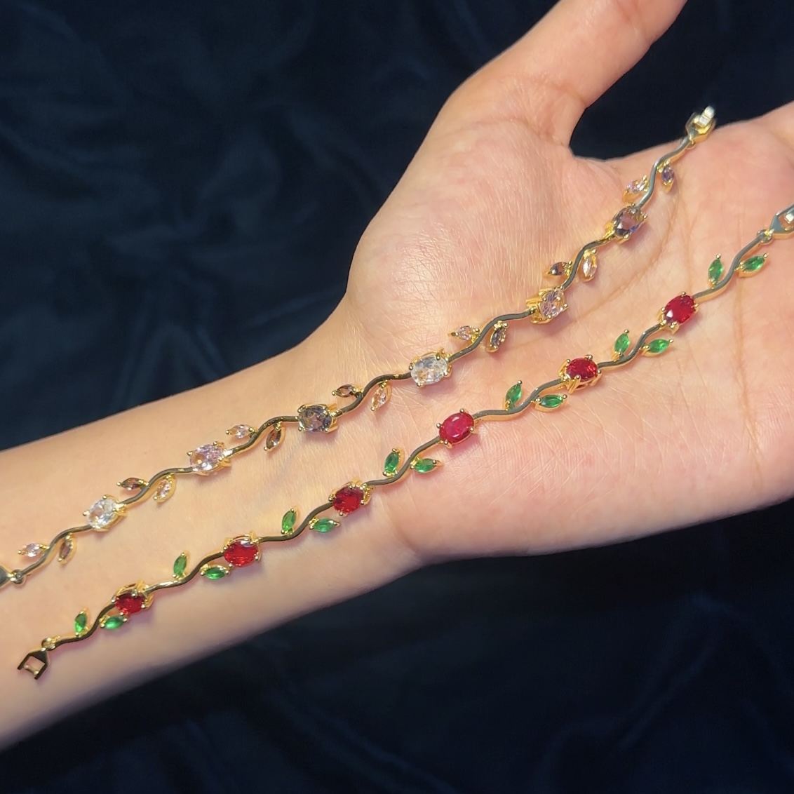 A delicate bracelet inspired by blooming tulips, featuring rich red stones paired with subtle green leaf details along a flowing vine design. Elegant yet playful, it adds a soft pop of color to your wrist and stands beautifully on its own. Style it with neutral outfits or soft pastels to let the colors stand out, or pair it with a simple gold bracelet on the other hand for a balanced, garden-inspired look.