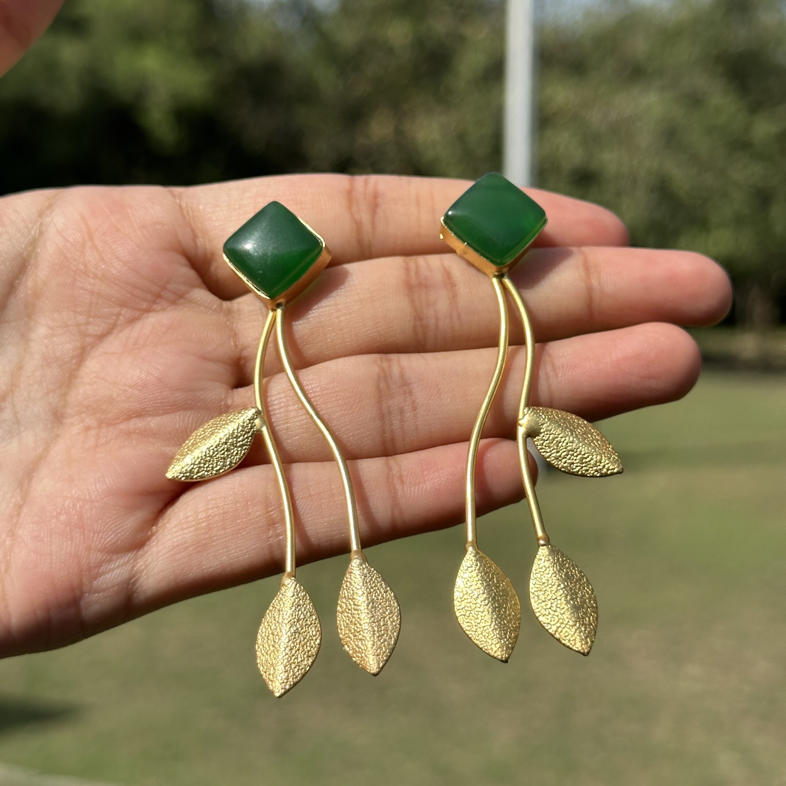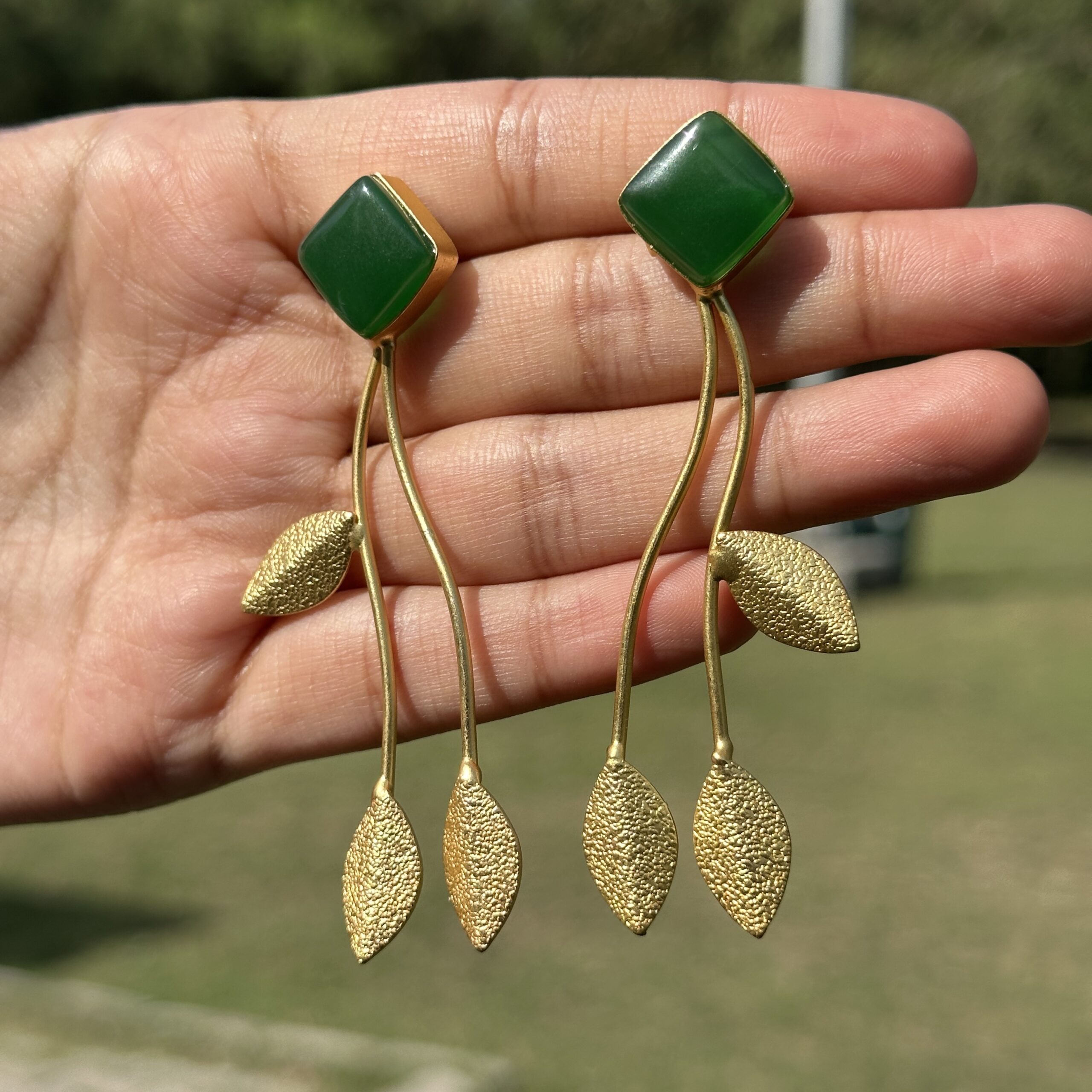 A pair of handcrafted Jaipuri brass earrings designed with a rich semi-precious green stone top and elegant gold-finish leaf drops that beautifully mimic the look of pure gold. Inspired by Jaipur’s artisan heritage, the piece blends traditional brass craftsmanship with uncut-stone aesthetics, creating a statement that feels regal, graceful, and timeless. The flowing leaf silhouette adds soft movement, making these earrings perfect for festive wear, destination weddings, or elevated ethnic looks. Style these with a solid black, ivory, or deep green kurta/saree and keep the neck bare so the earrings become the hero piece. They will look especially stunning with a sleek bun or soft curls tucked behind the ear.